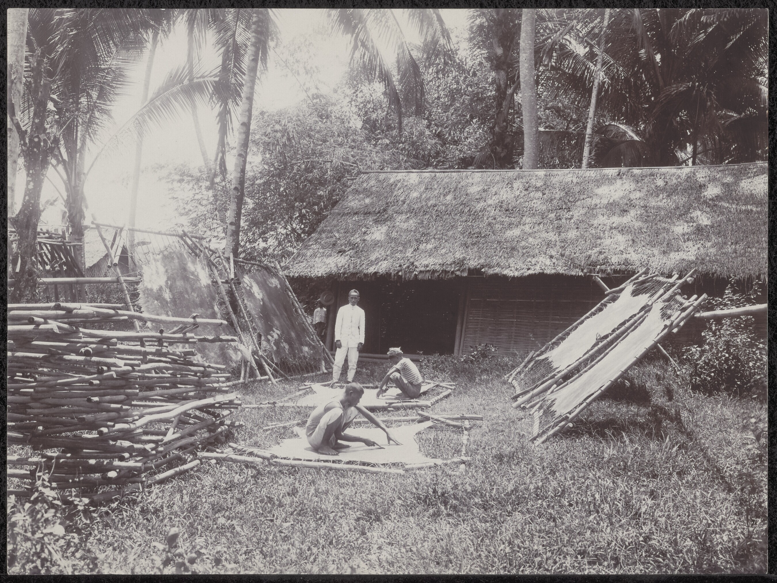 Indonesiërs naast een stapel dierenhuiden, waarvan v...