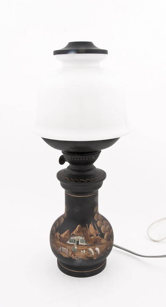 Lamp van zwart gespoten tin met melkglazen kap, verv...