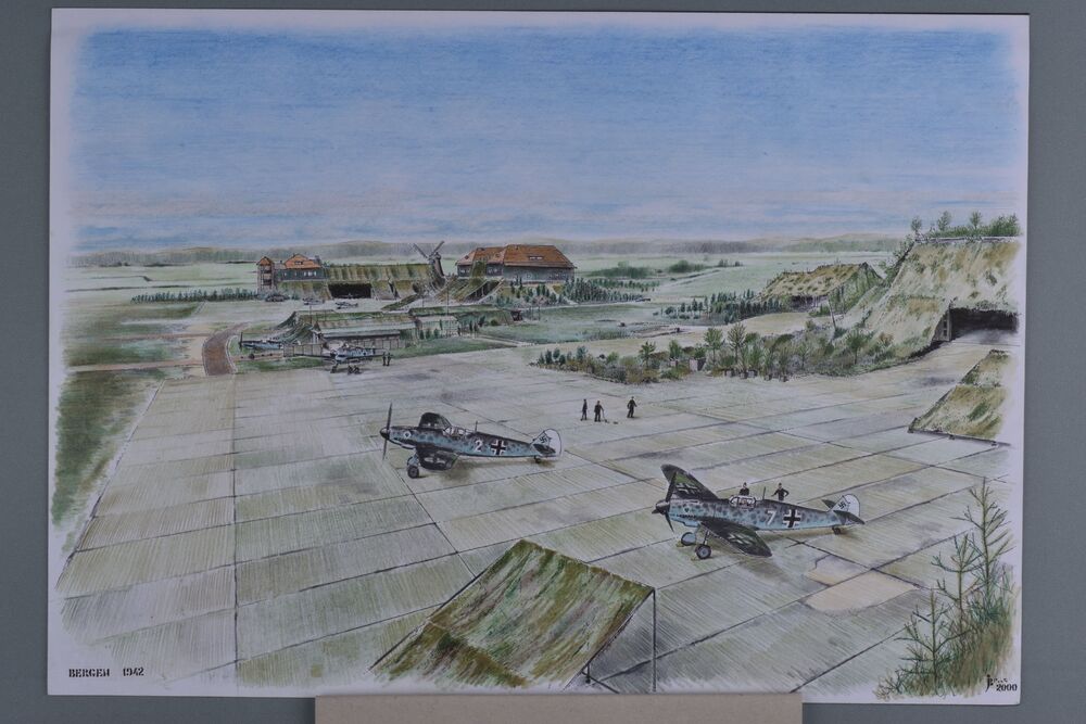 Pasteltekening 'Bergen 1942' met Me-109's op het pla...
