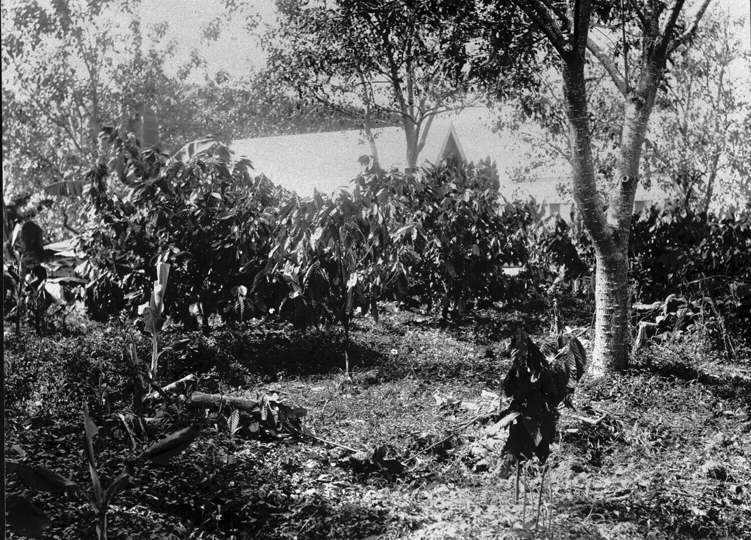 Opkomst van jonge cacaobomen, het oude veld is door ...