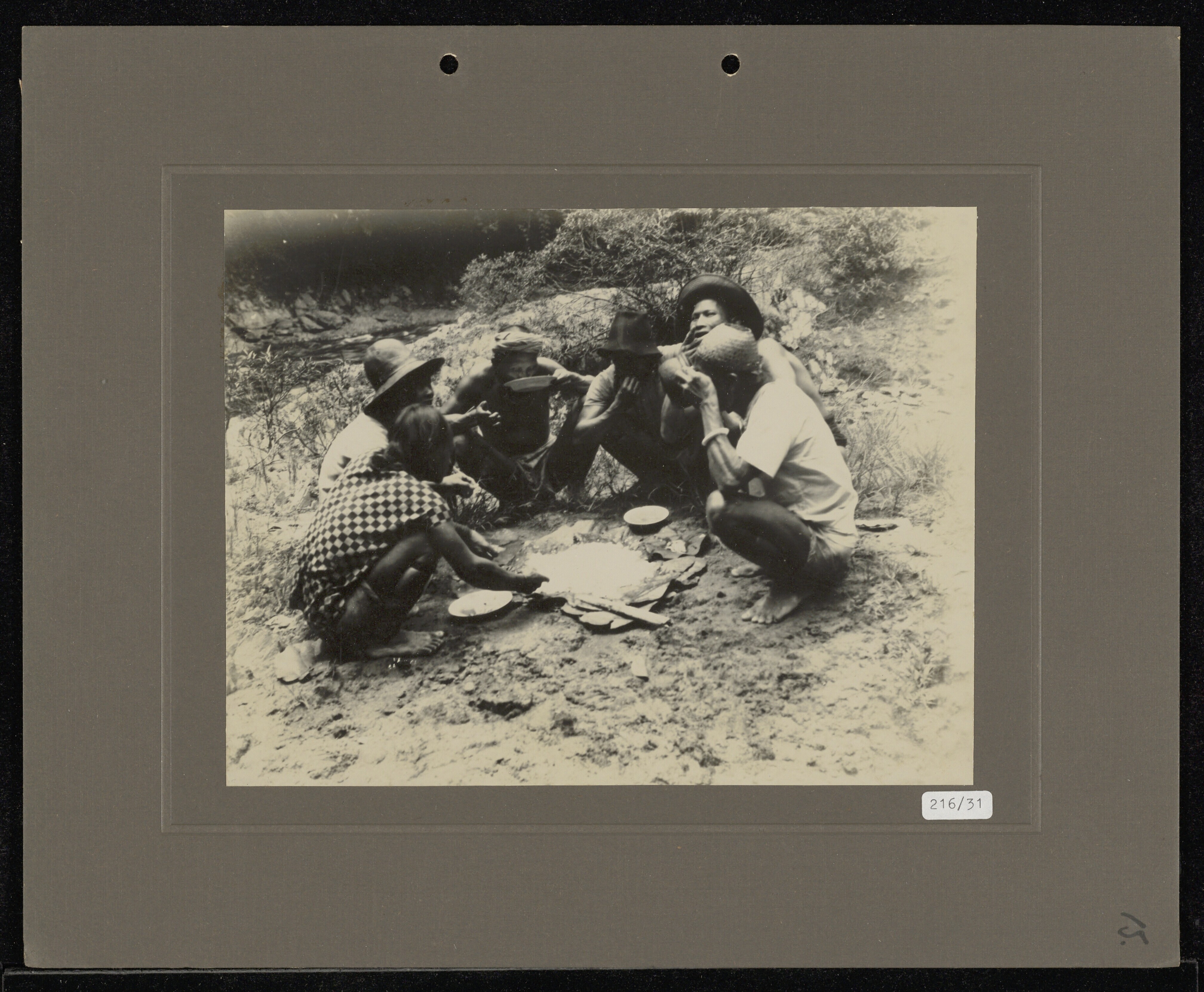 Dayak men having a meal beside a river