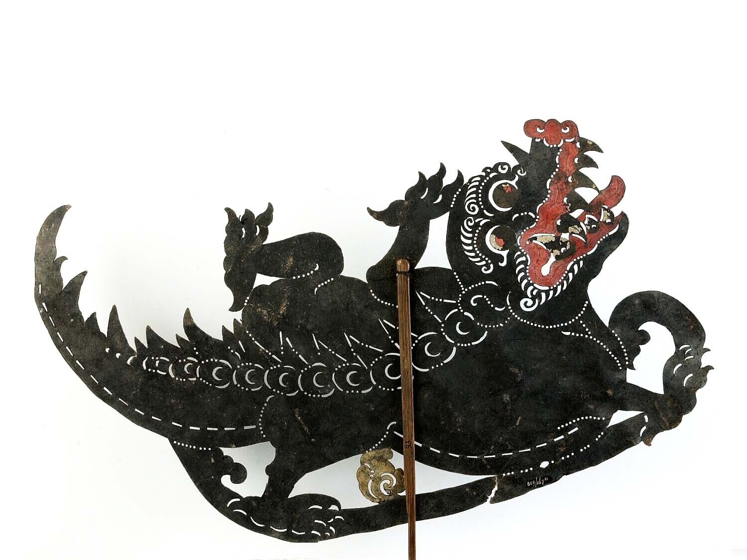 Wajangfiguur voorstellende een krokodil, die in de h...