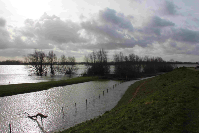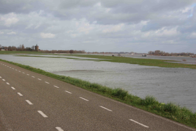 Dijk langs de Waal bij Tiel tijdens hoog water, febr...