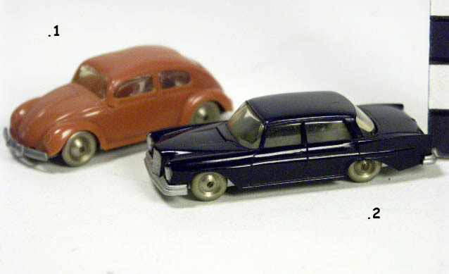 Personenauto's Volkswagen Kever en Mercedes 220S