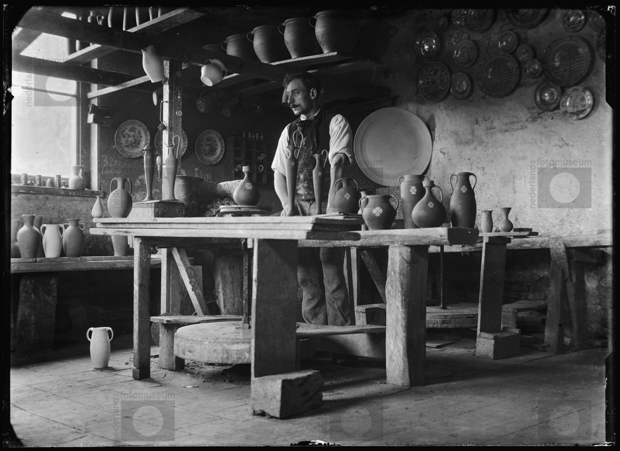 H. Andrée aan het werk in de pottenbakkerij van hem ...