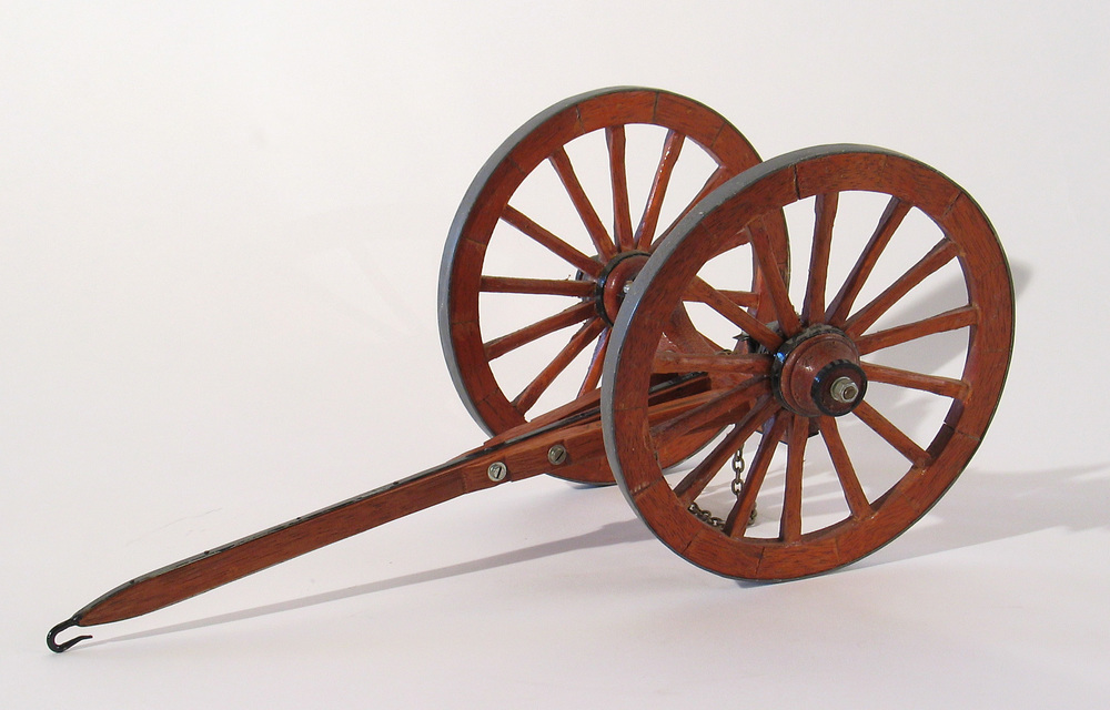 Kar, miniatuur, op 2 wielen, van hout en ijzer, verv...