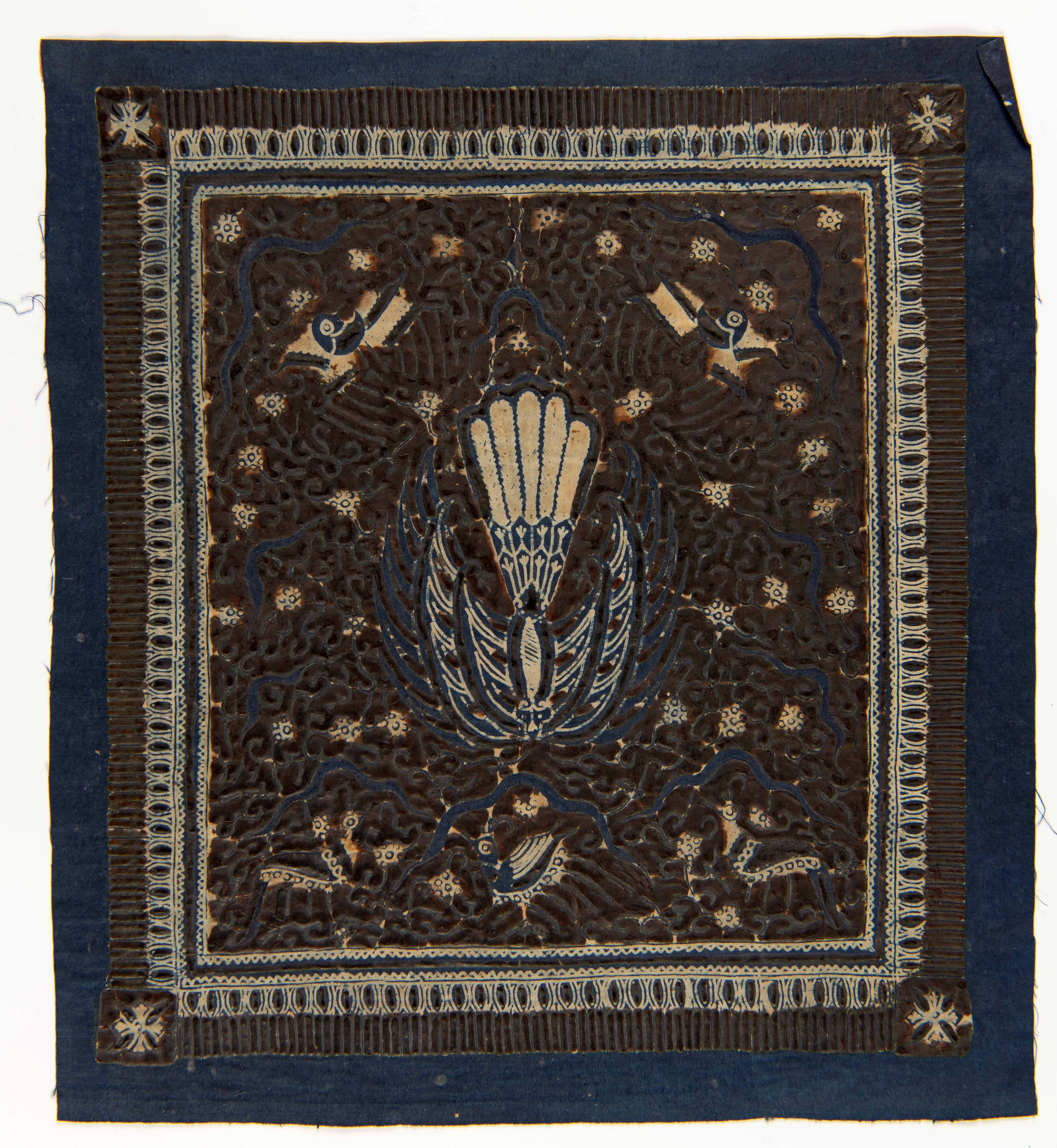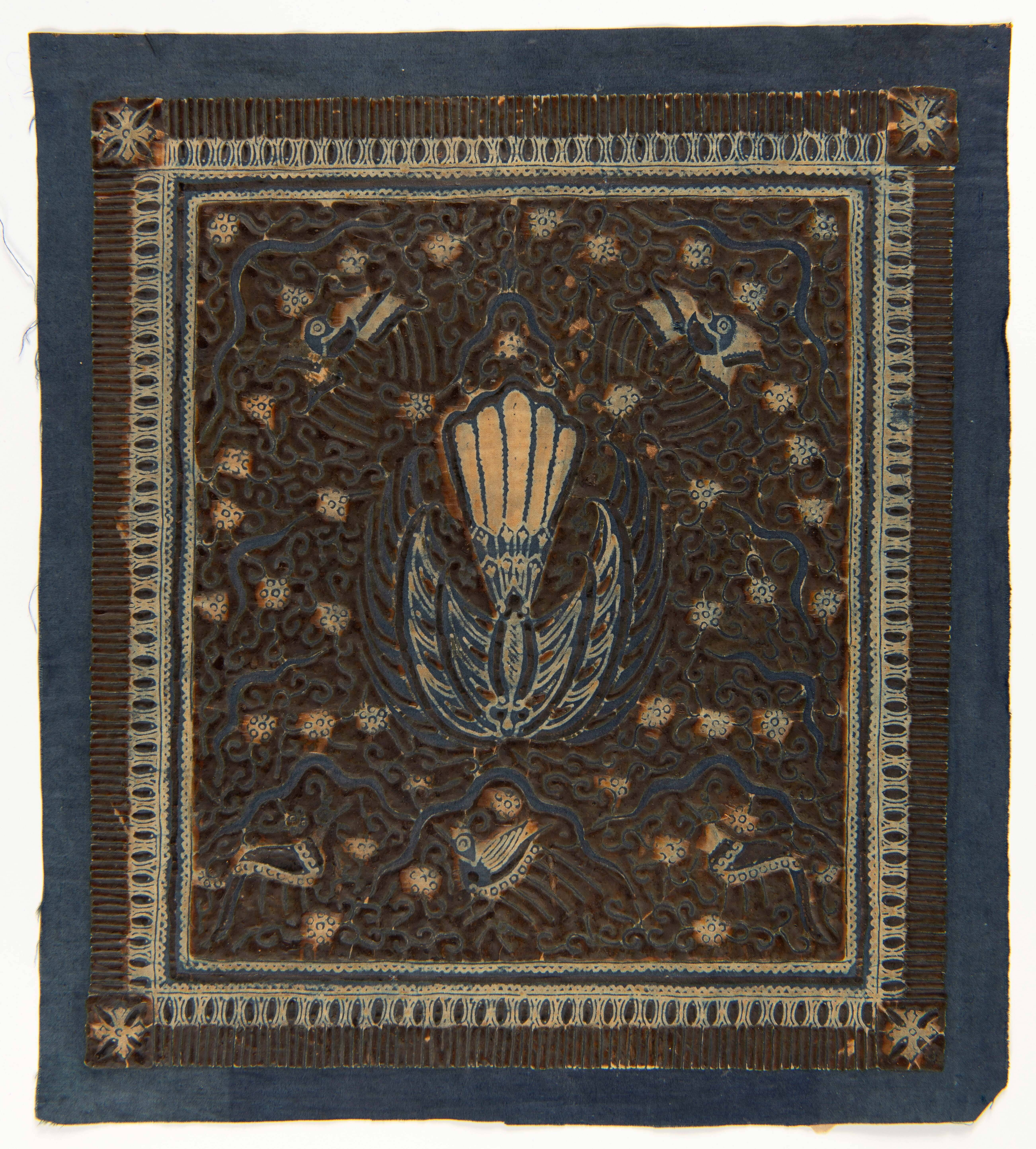 Blauw gebatikt katoenen doek, versierd met het rusak...
