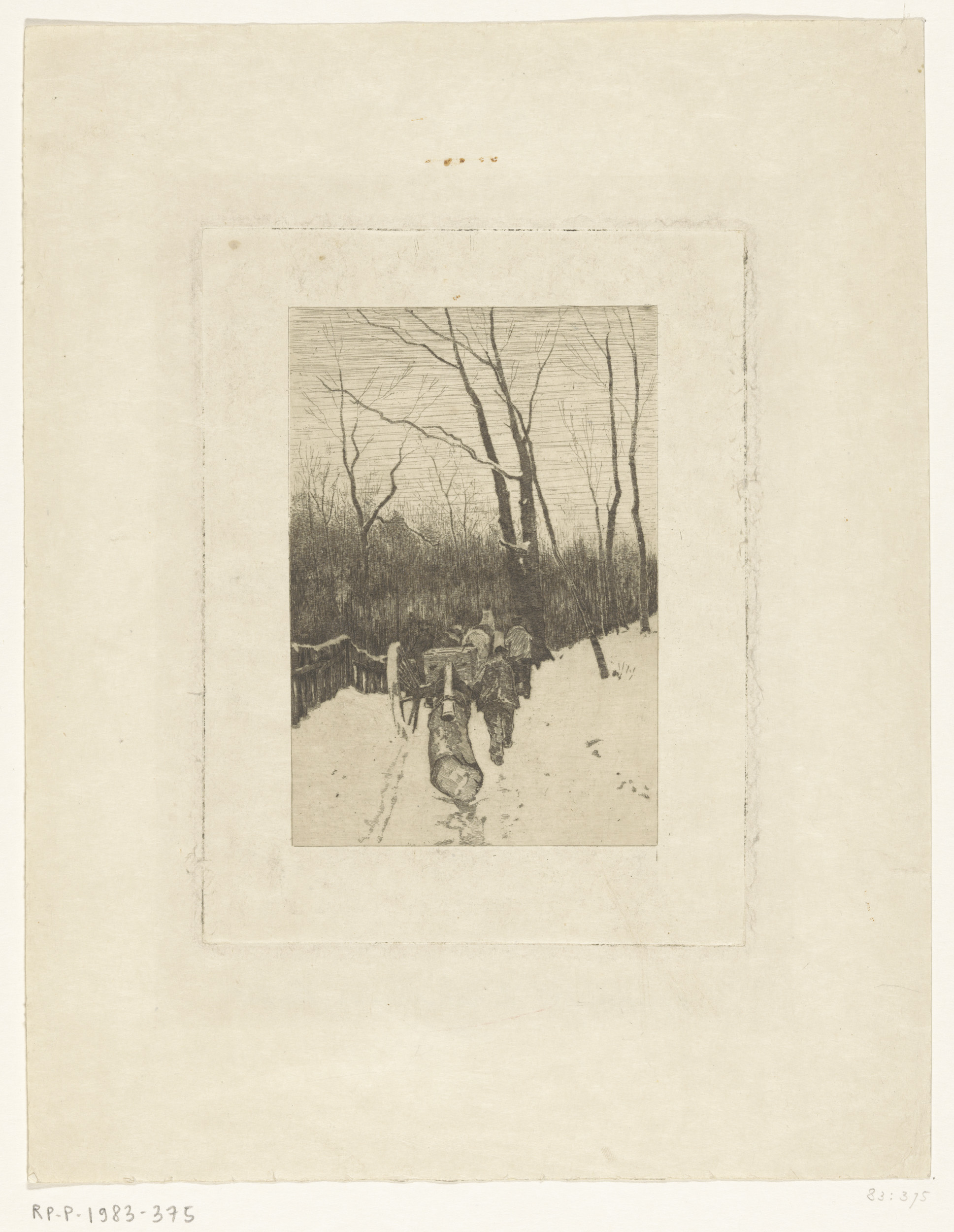 Paarden die een boomstam voortslepen over een besnee...