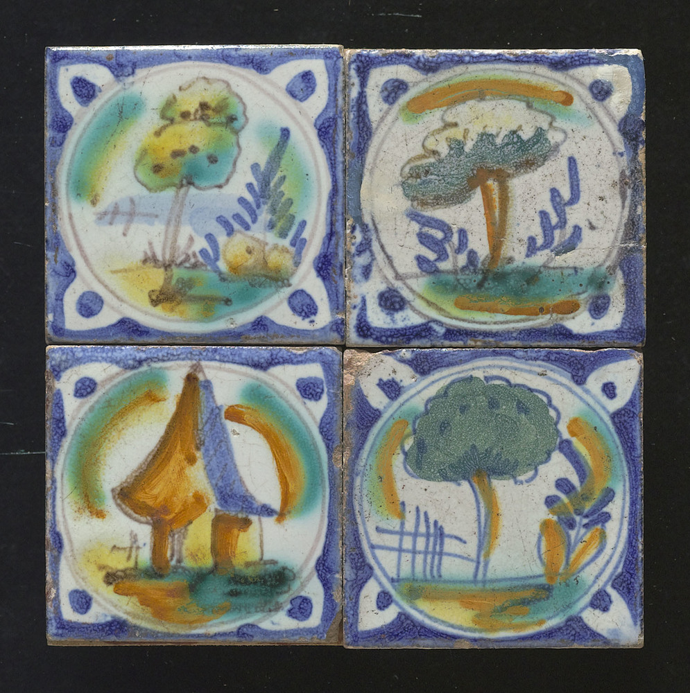 Vier tegels van aardewerk met tinglazuur voorstellen...