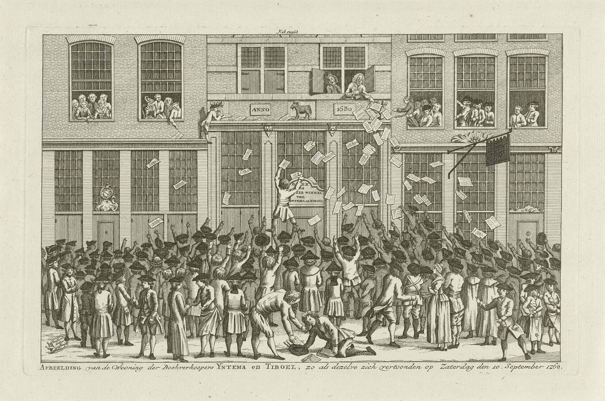 Uitstrooien van een pamflet door de uitgevers Yntema...