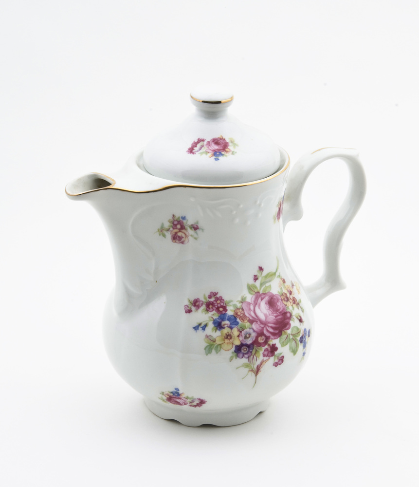 Koffie- en theeservies met vergulde biezen en bloeme...