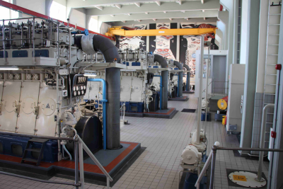 Voorzijde van één van de vier dieselmotoren van gema...