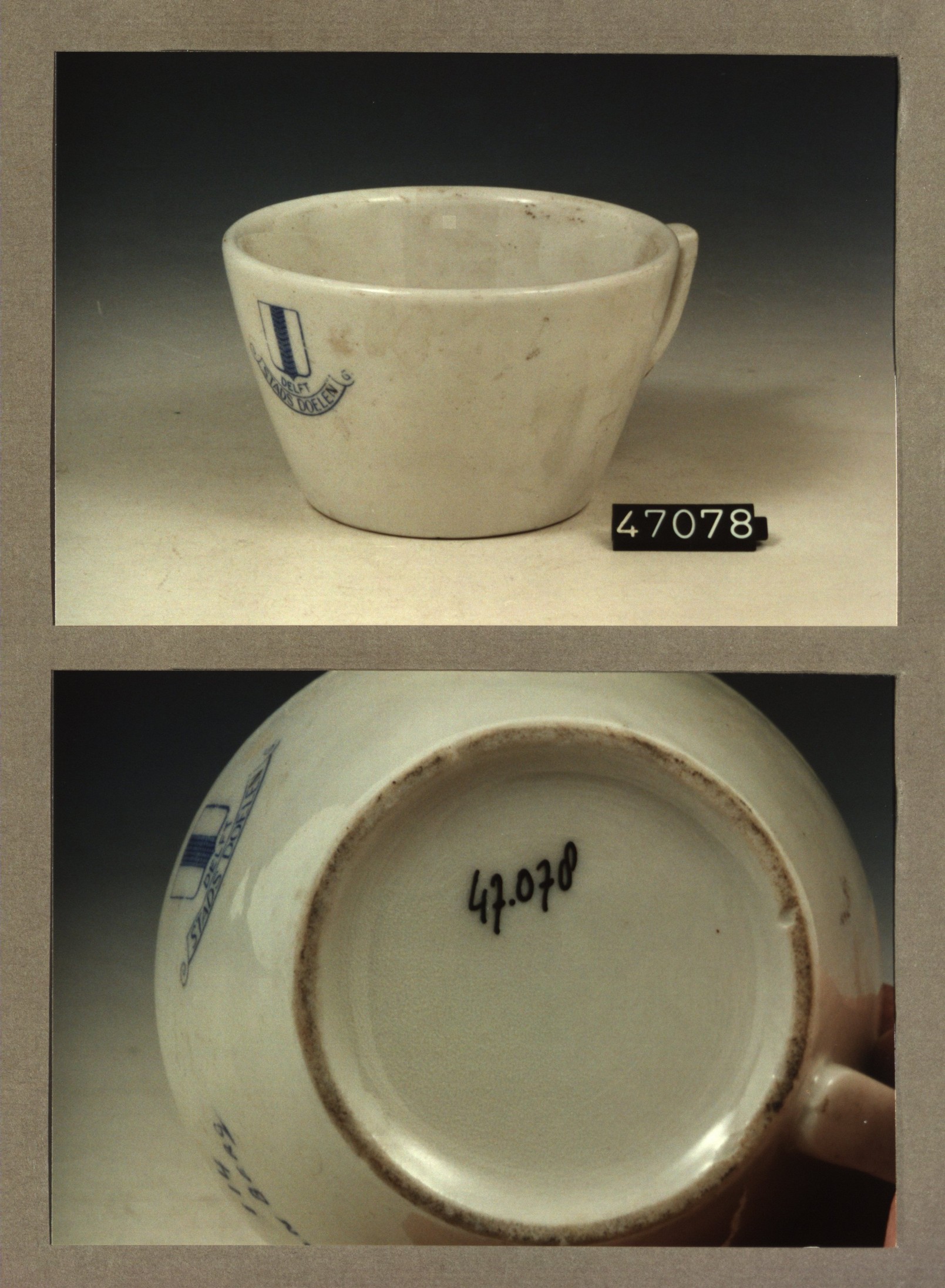 Kop met opschrift, model P met decor Stads doelen Delft