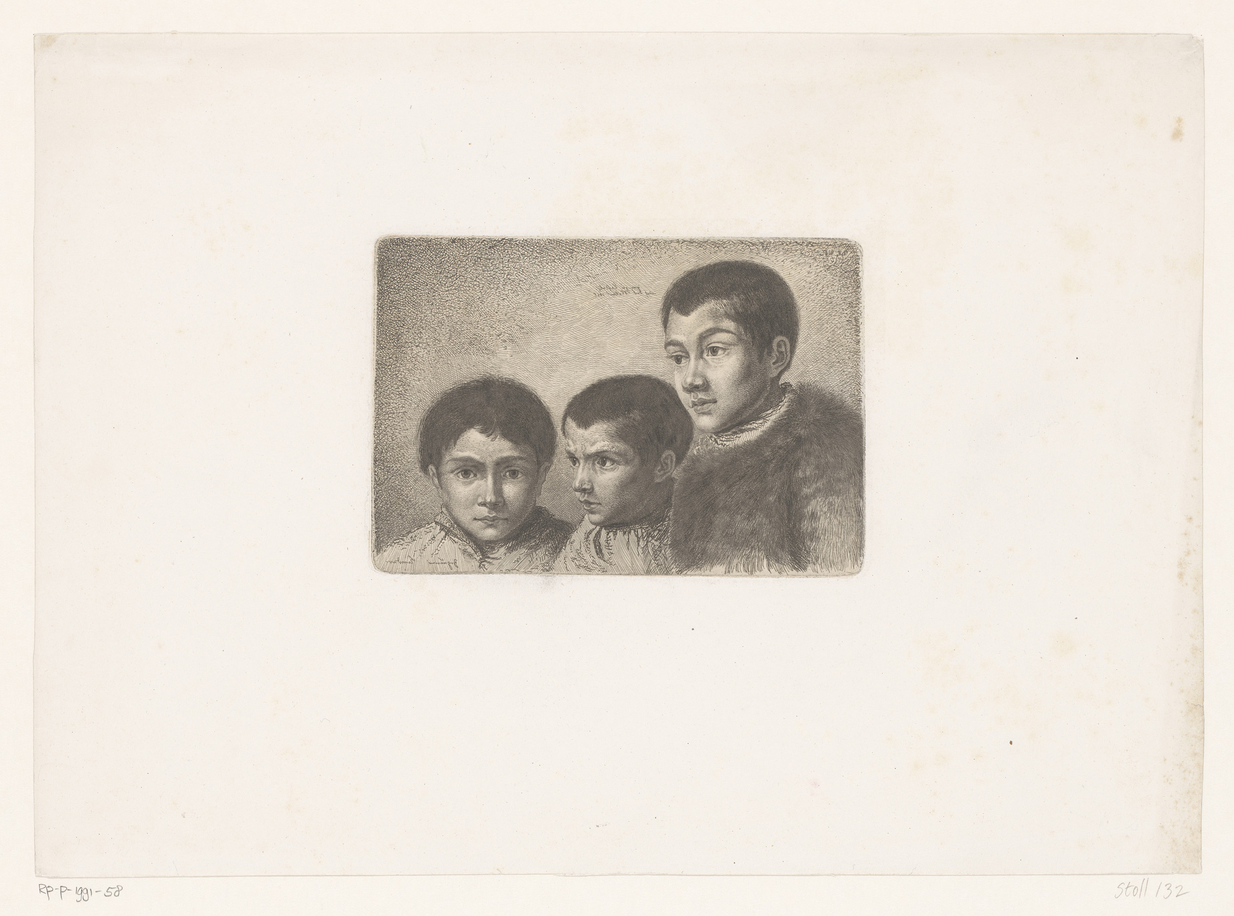 Interieur met twee staande jongens die tekeningen be...