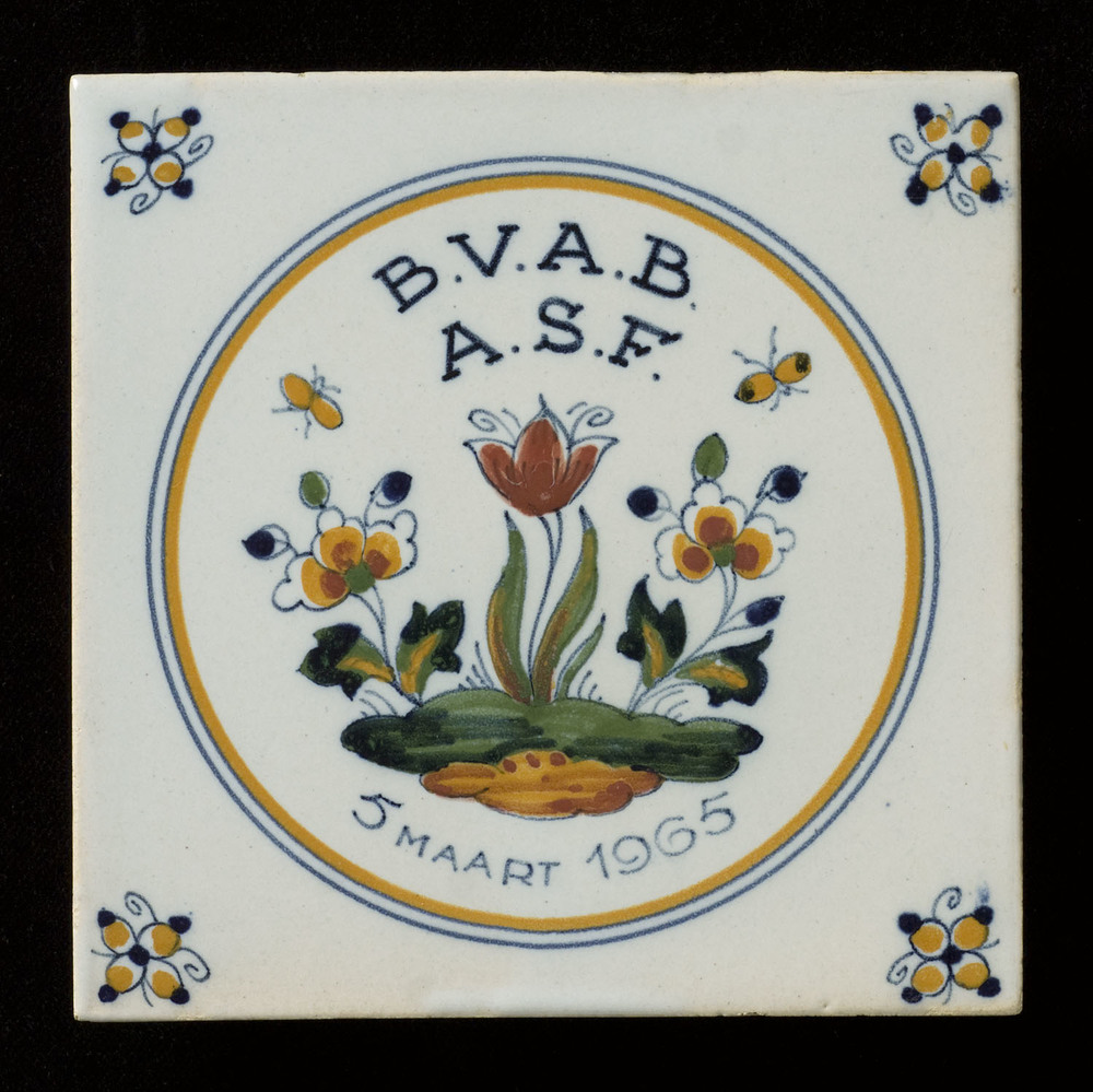 Tegel met tinglazuur en de afkortingen BVAB eb ASF, ...