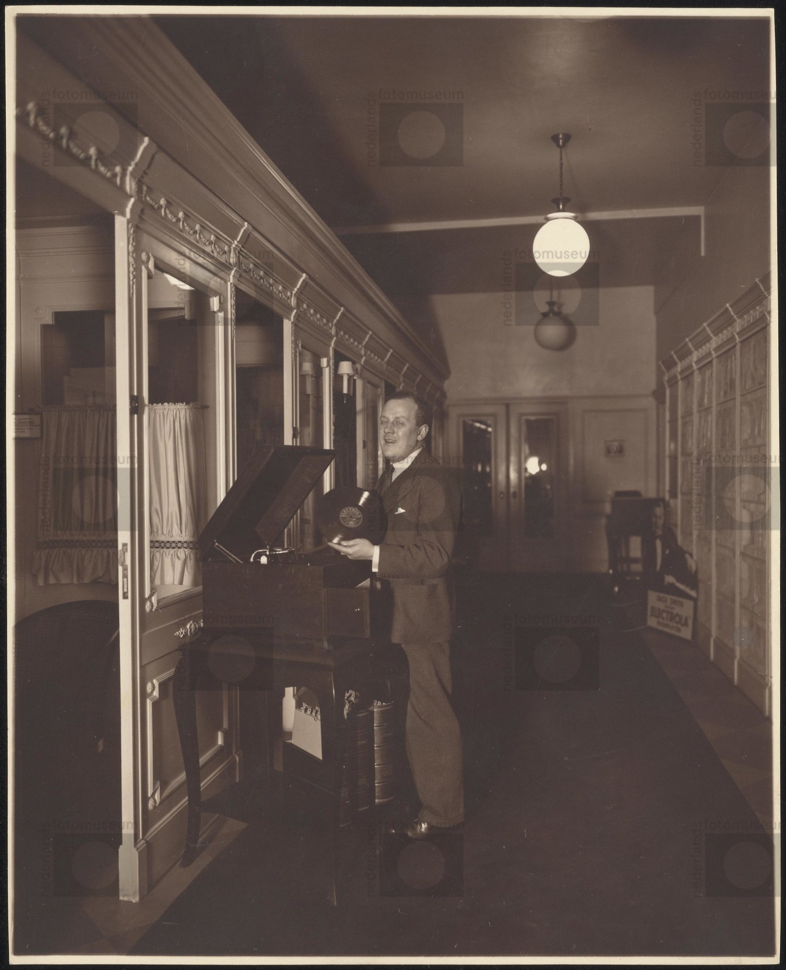 Jacq. Hilton met grammofoonplaat in muziekwinkel|[We...