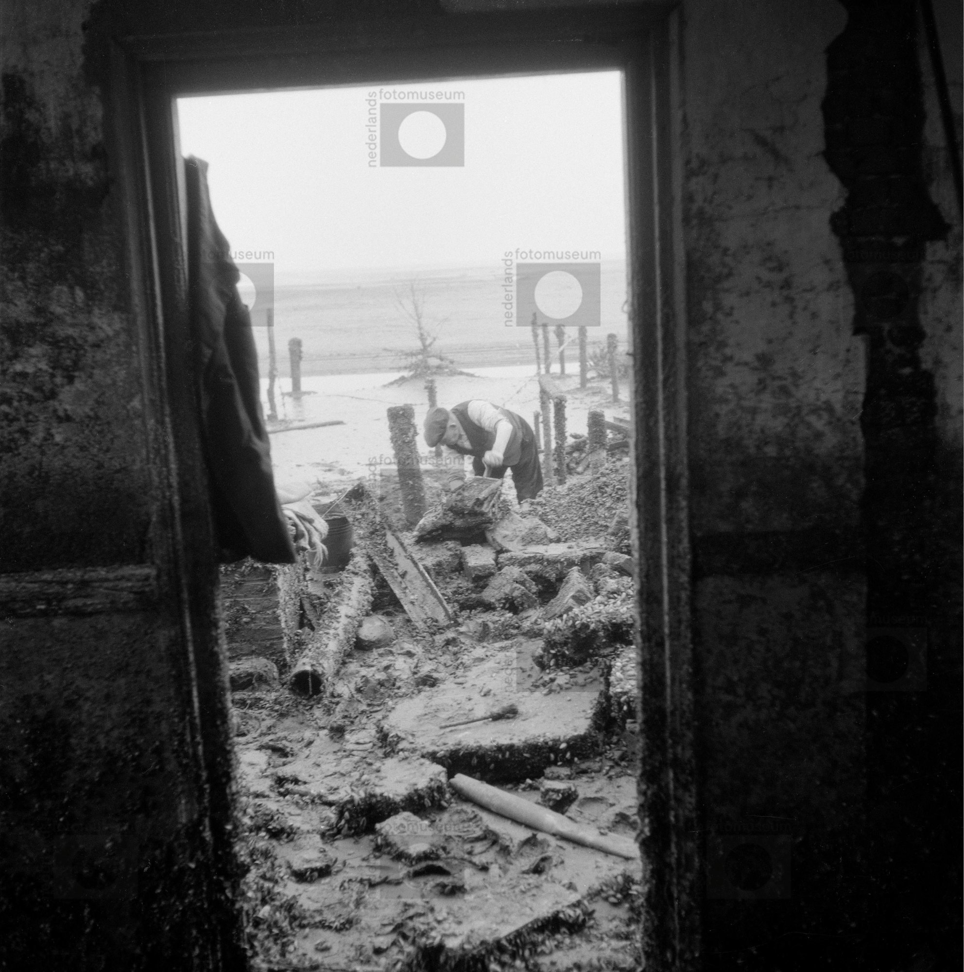 Man op Schouwen buiten woonhuis bezig met werkzaamhe...