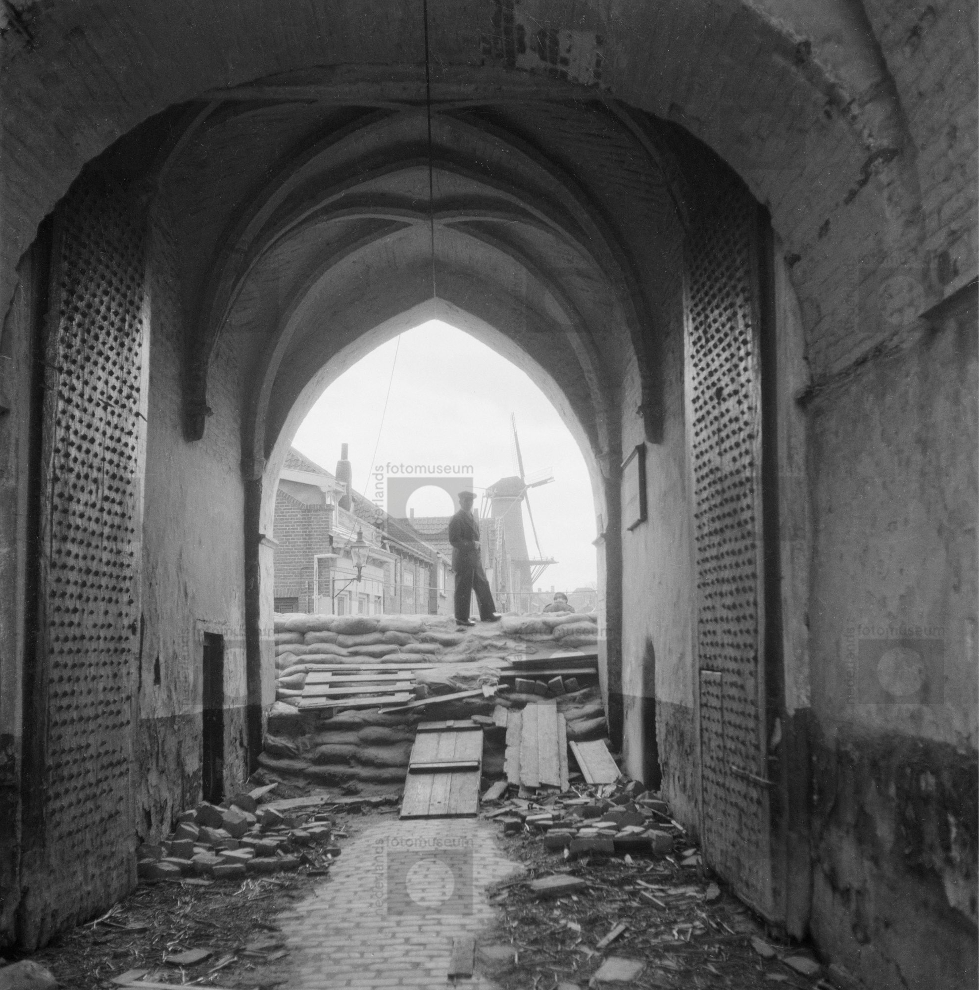 Man staat op stapel zandzakken in straat met molen o...