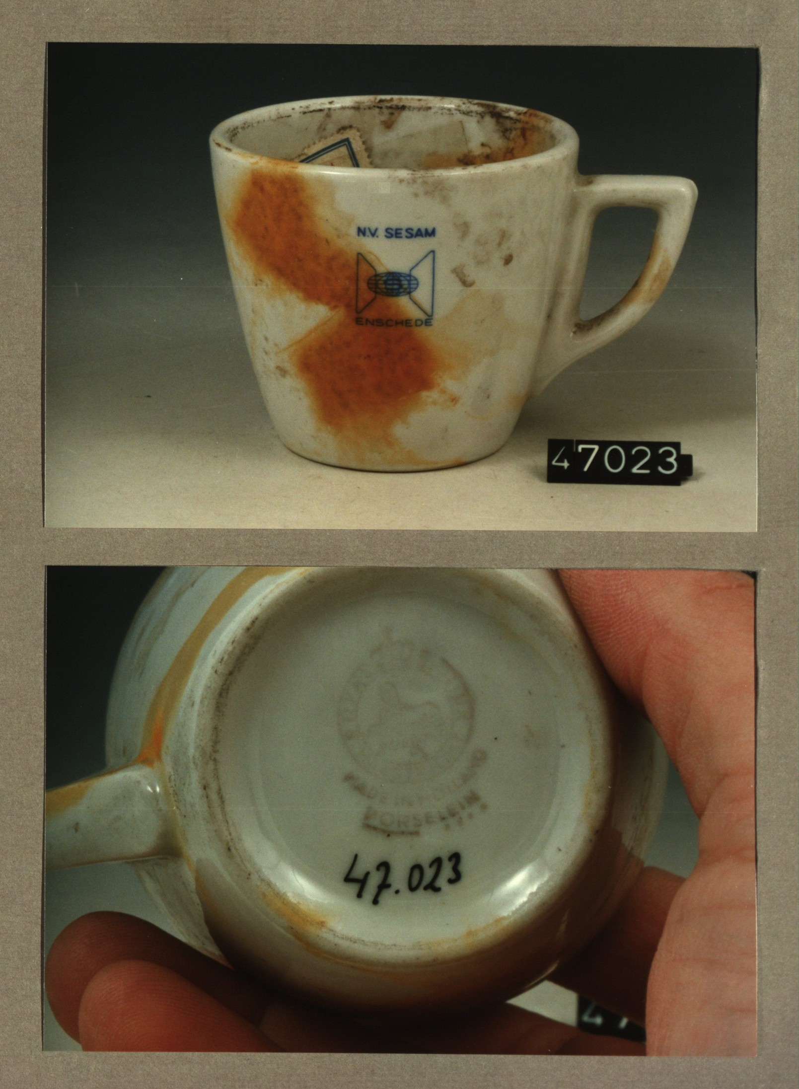 Kop met opschrift, model P2 met decor Sesam NV Enschede