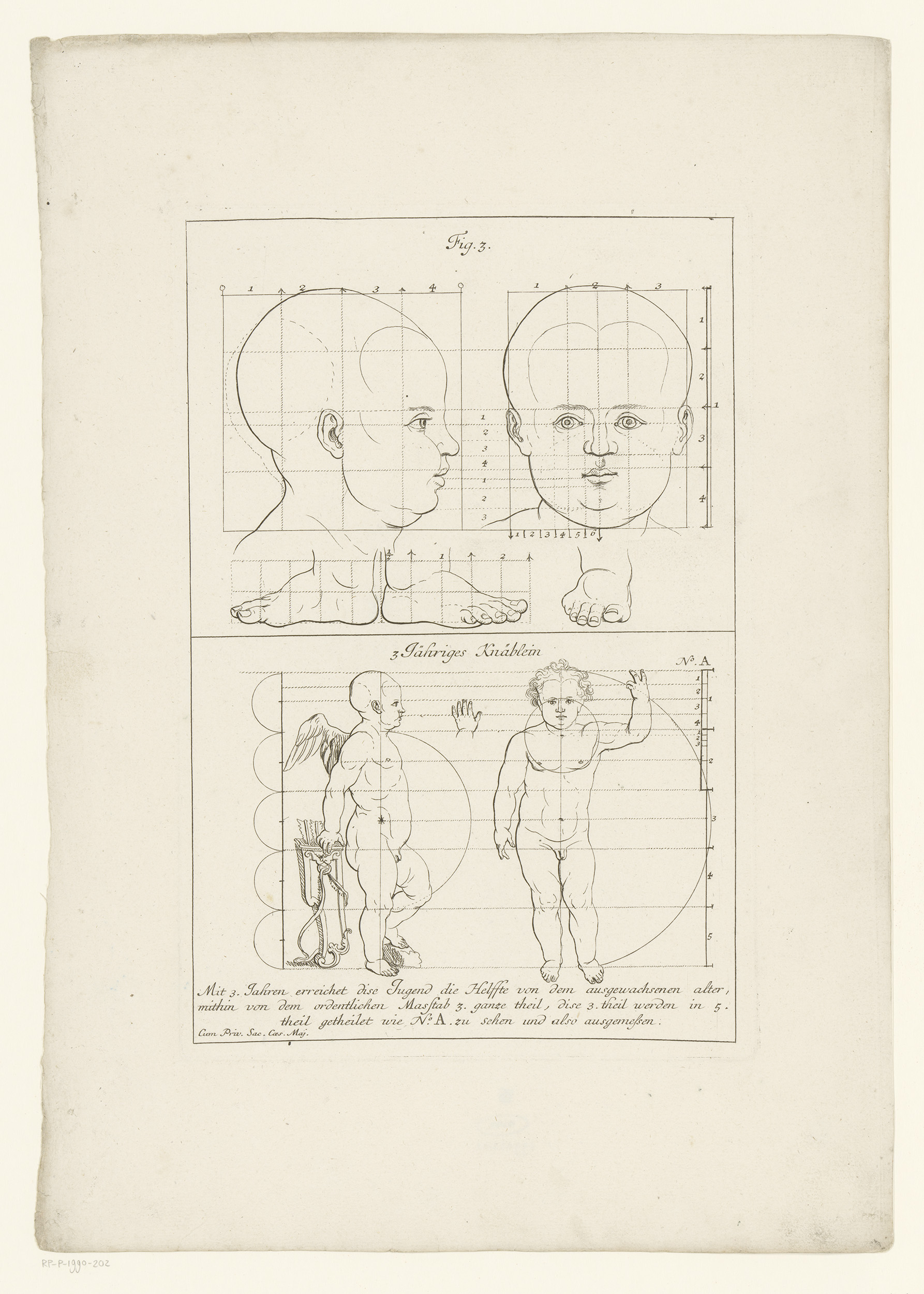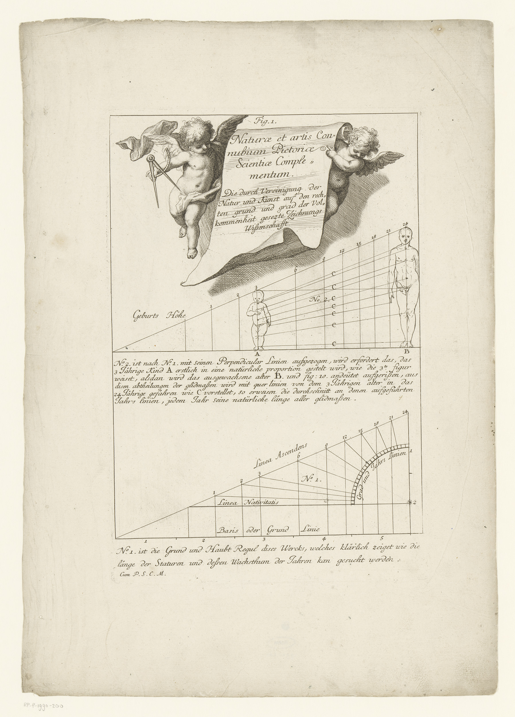 Putti met meetinstrumenten en aanzichten van een 3-j...