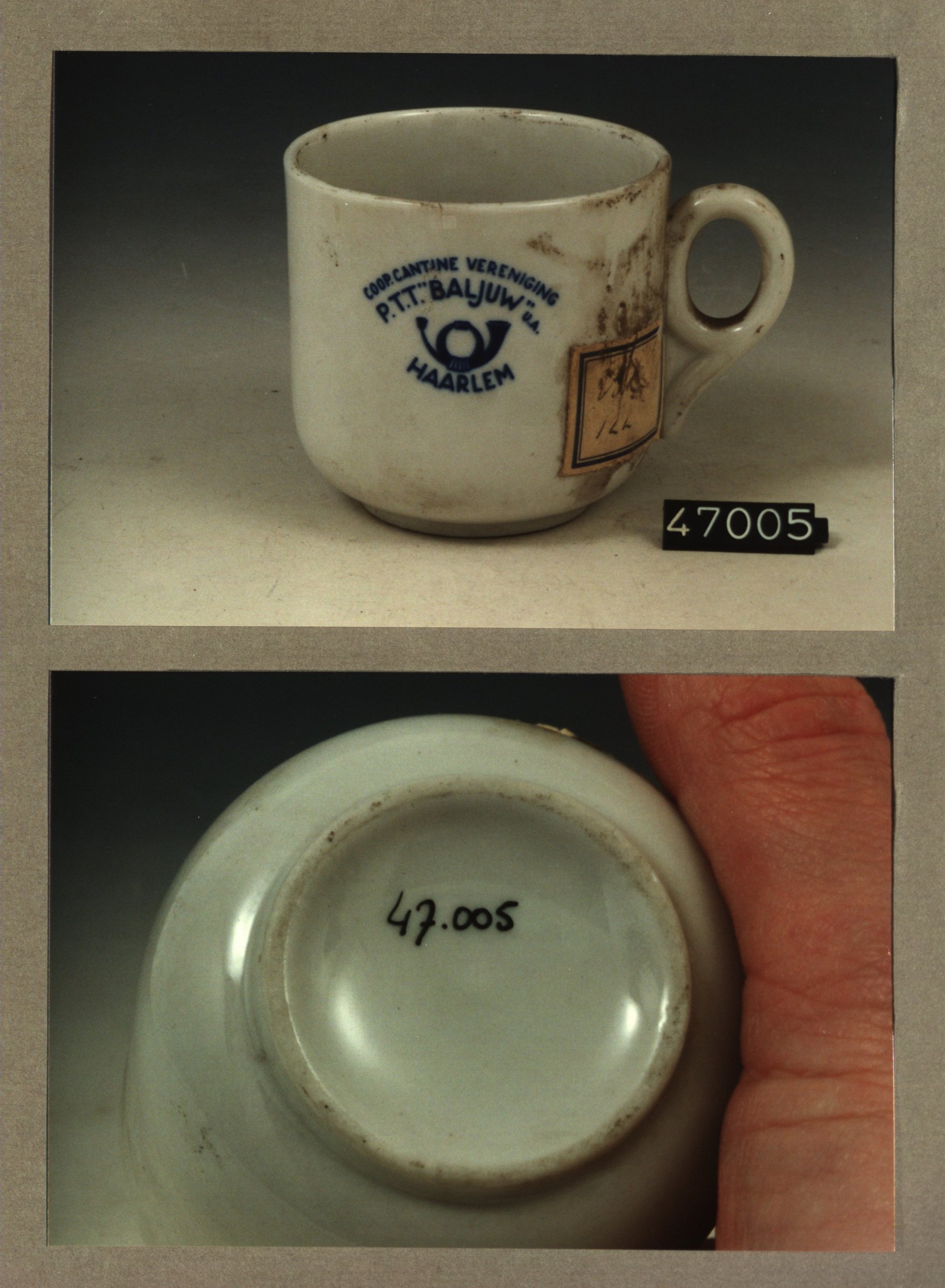 Kop met opschrift, model F met decor P.T.T.Baljuw ua...