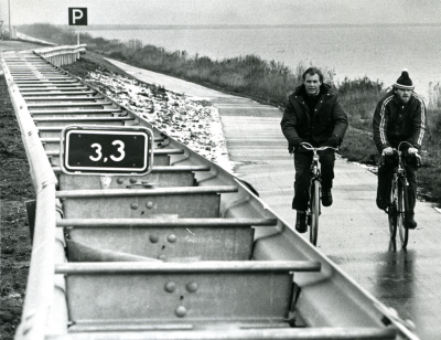 Fietsers op de Houtribdijk, winter 1976