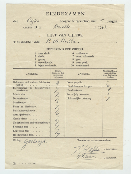 Cijferlijst van Pieter de Hullu (1926-1992) behorend...