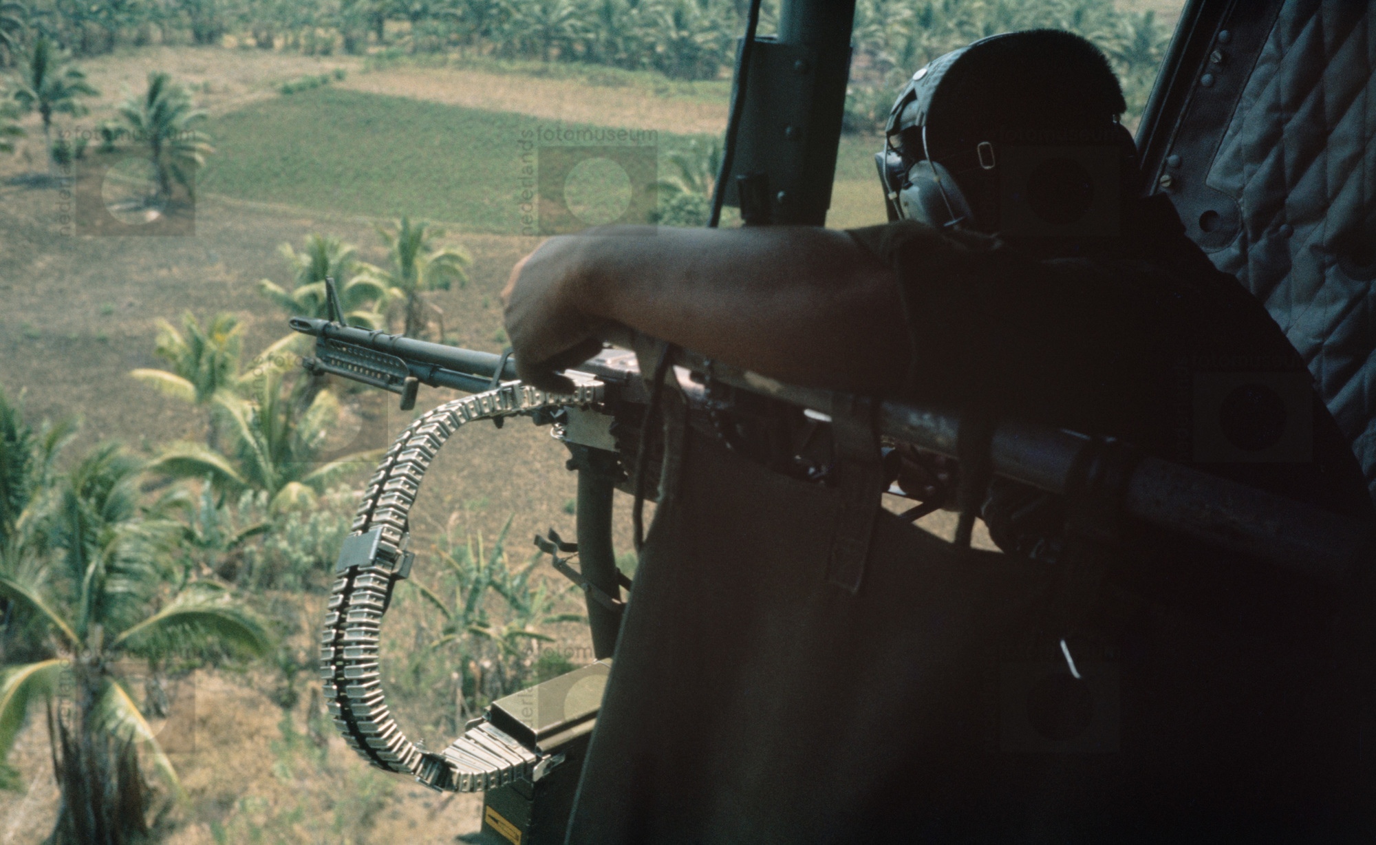 Soldaat met een machinegeweer in een helikopter, Fil...
