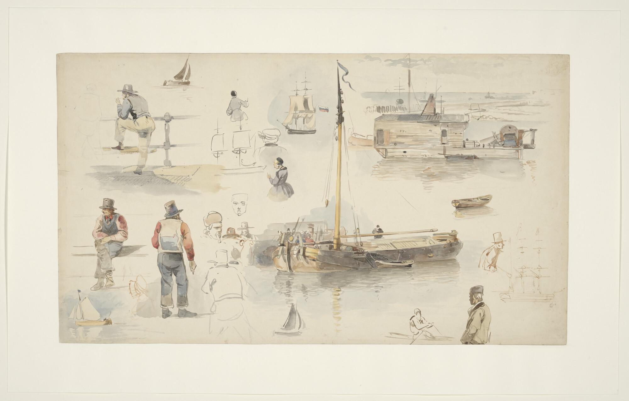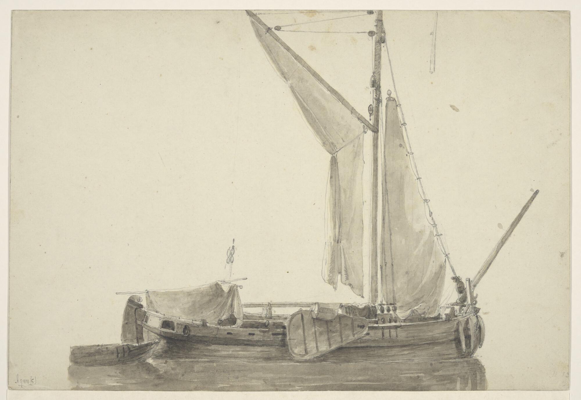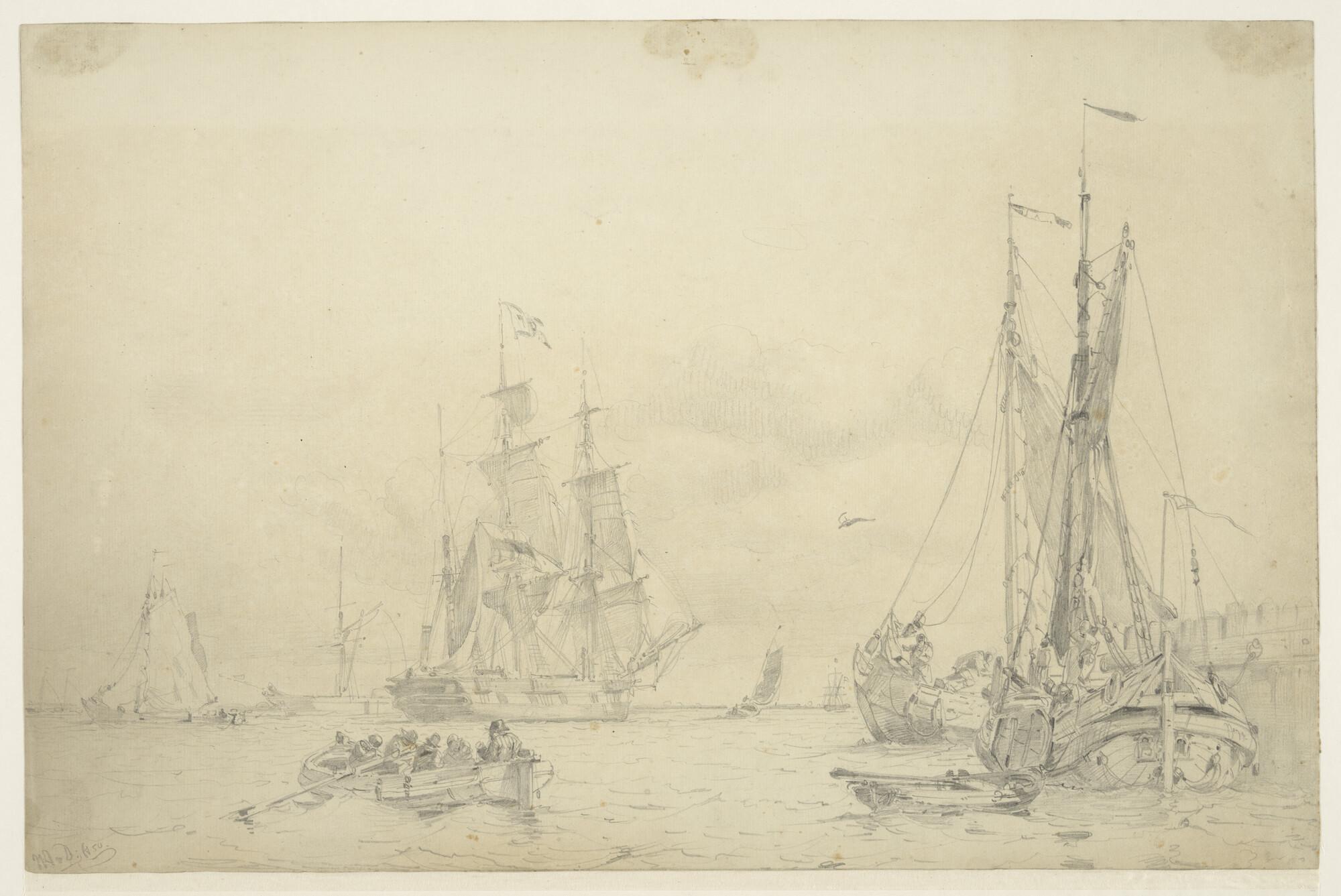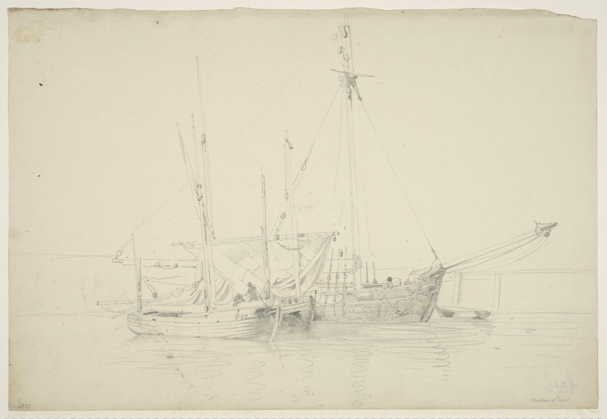 Een fregatschip, een sloep en twee tegen de kade afg...