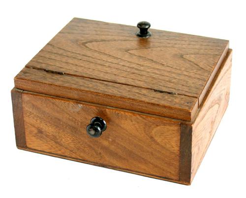 Spaarkistje, geldkistje. Eikenhouten kistje met sc...
