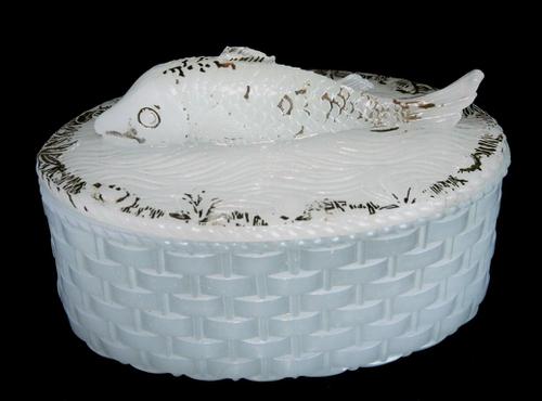 Wit glazen botervloot in de vorm van een ovalen mand...