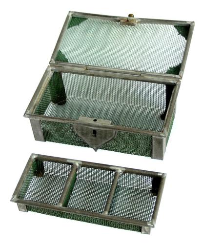 Spaarkorf. IJzeren geraamte met groen gaas.