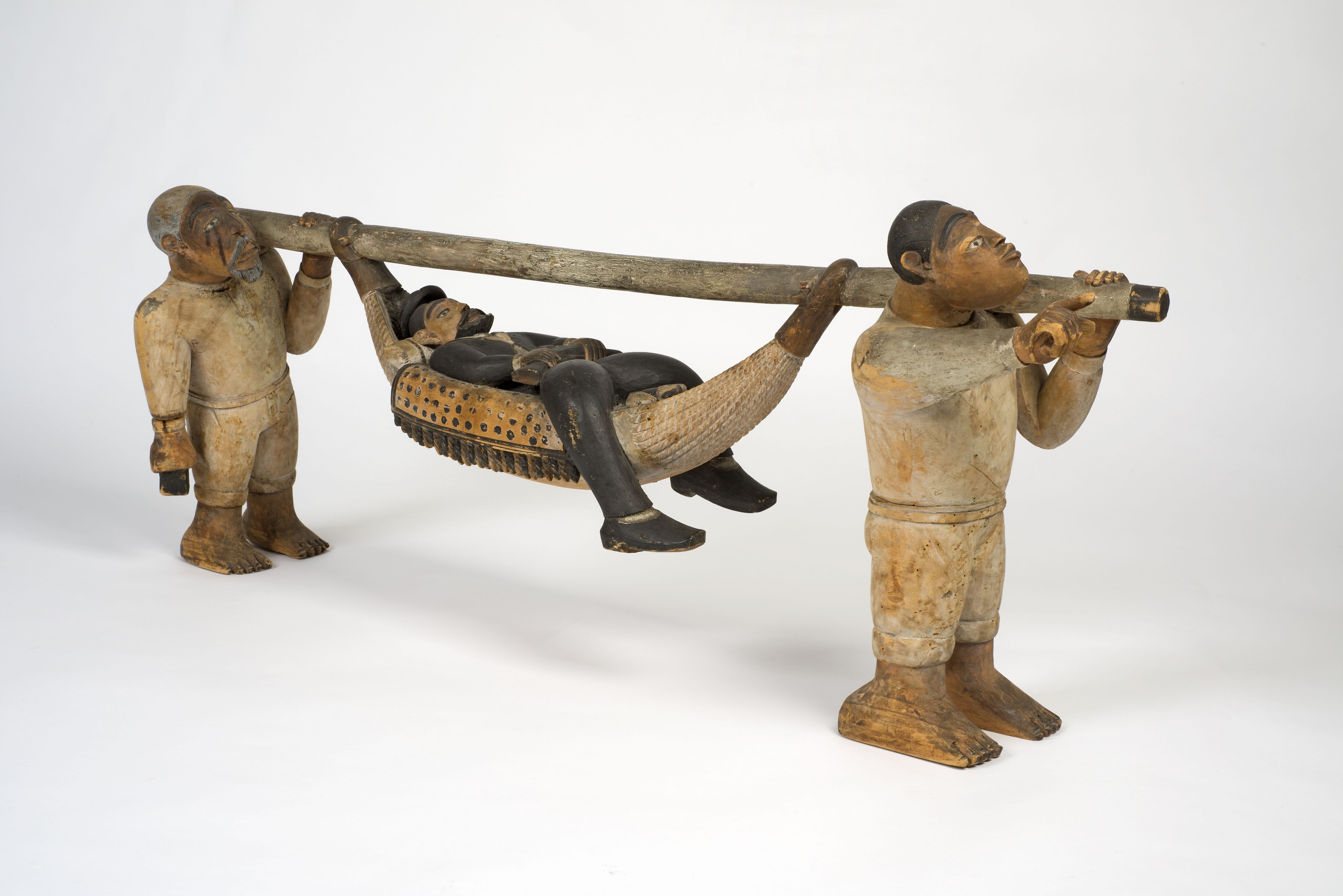 Twee Afrikaanse mannen dragen een Europese man in ha...