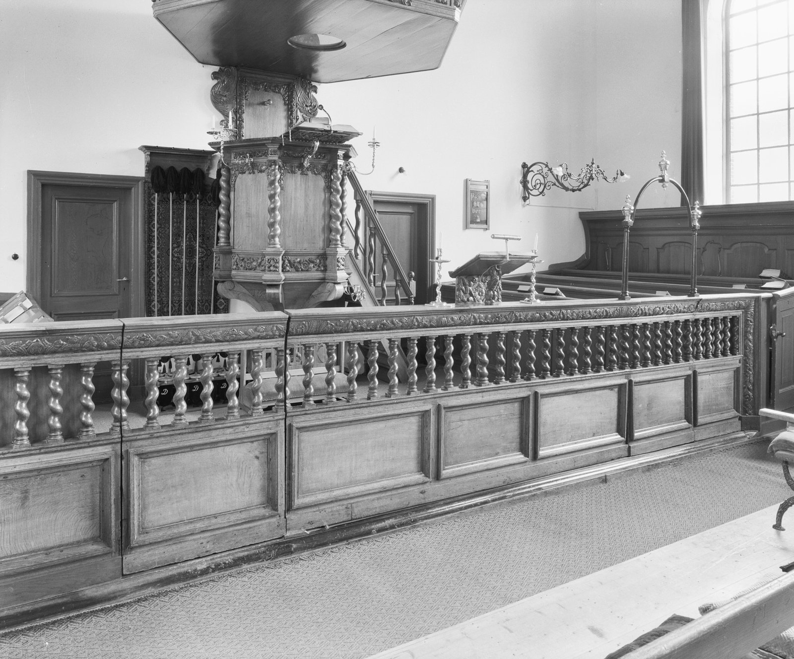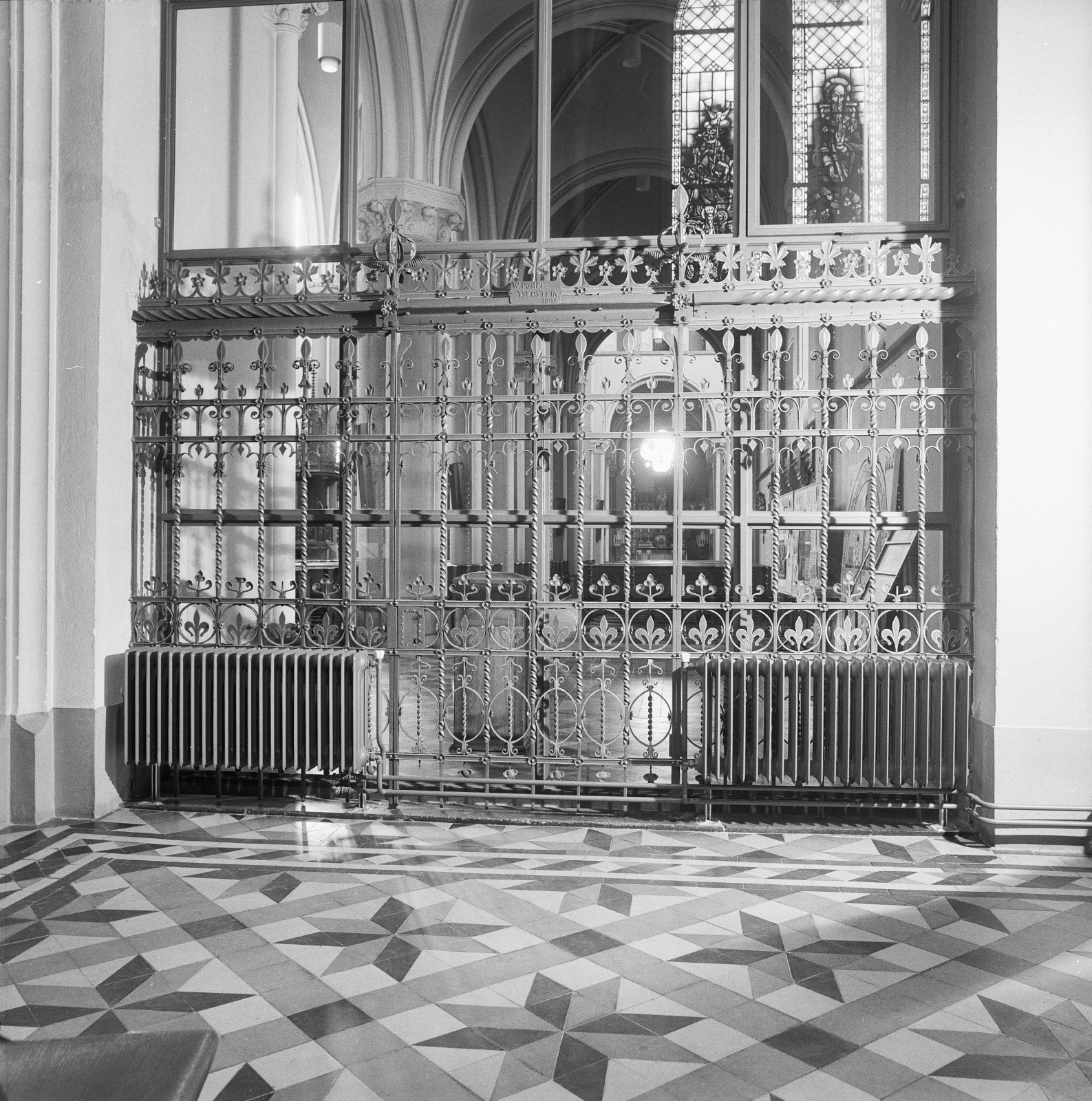 Interieur, ijzeren hek op de scheiding van de voorma...