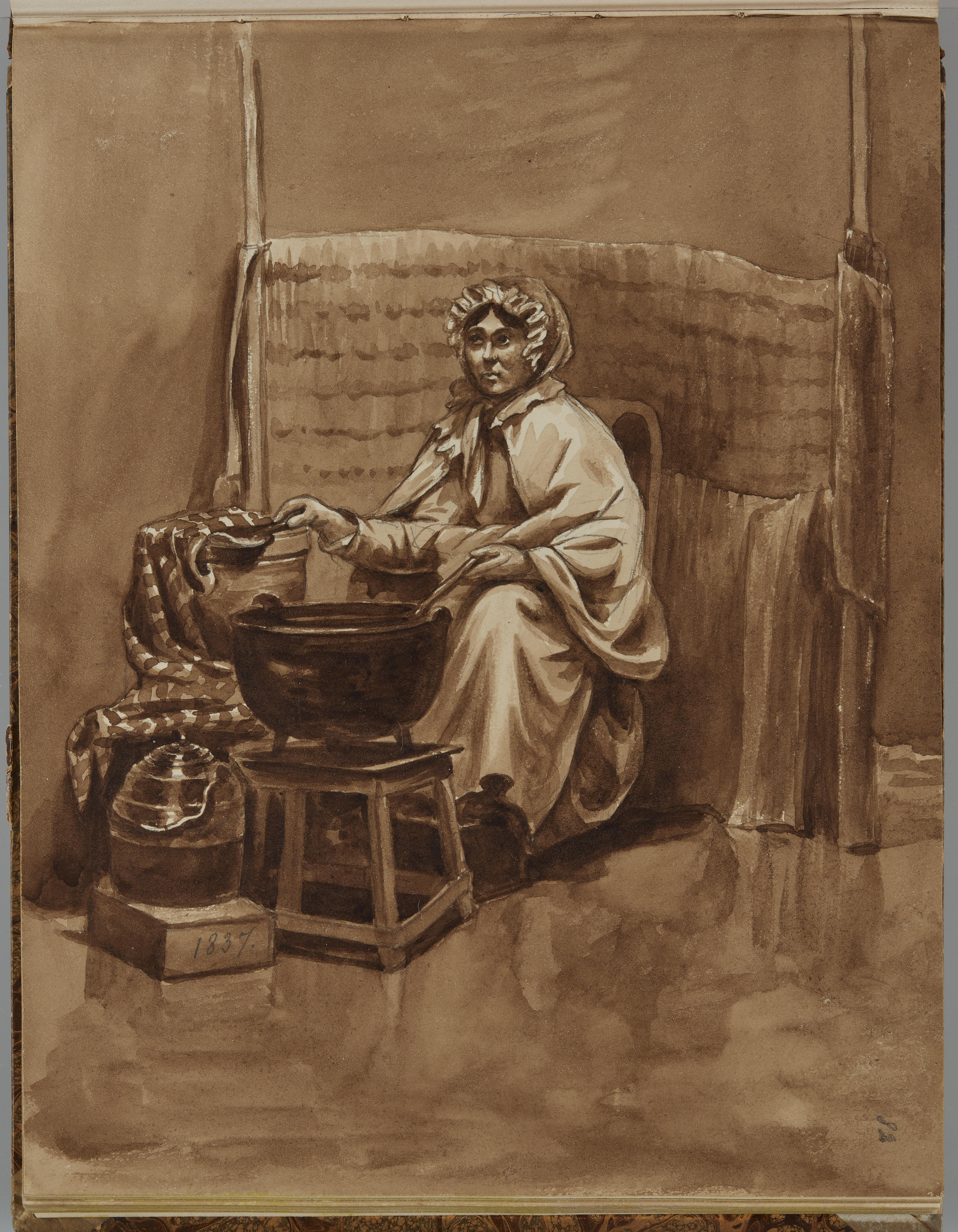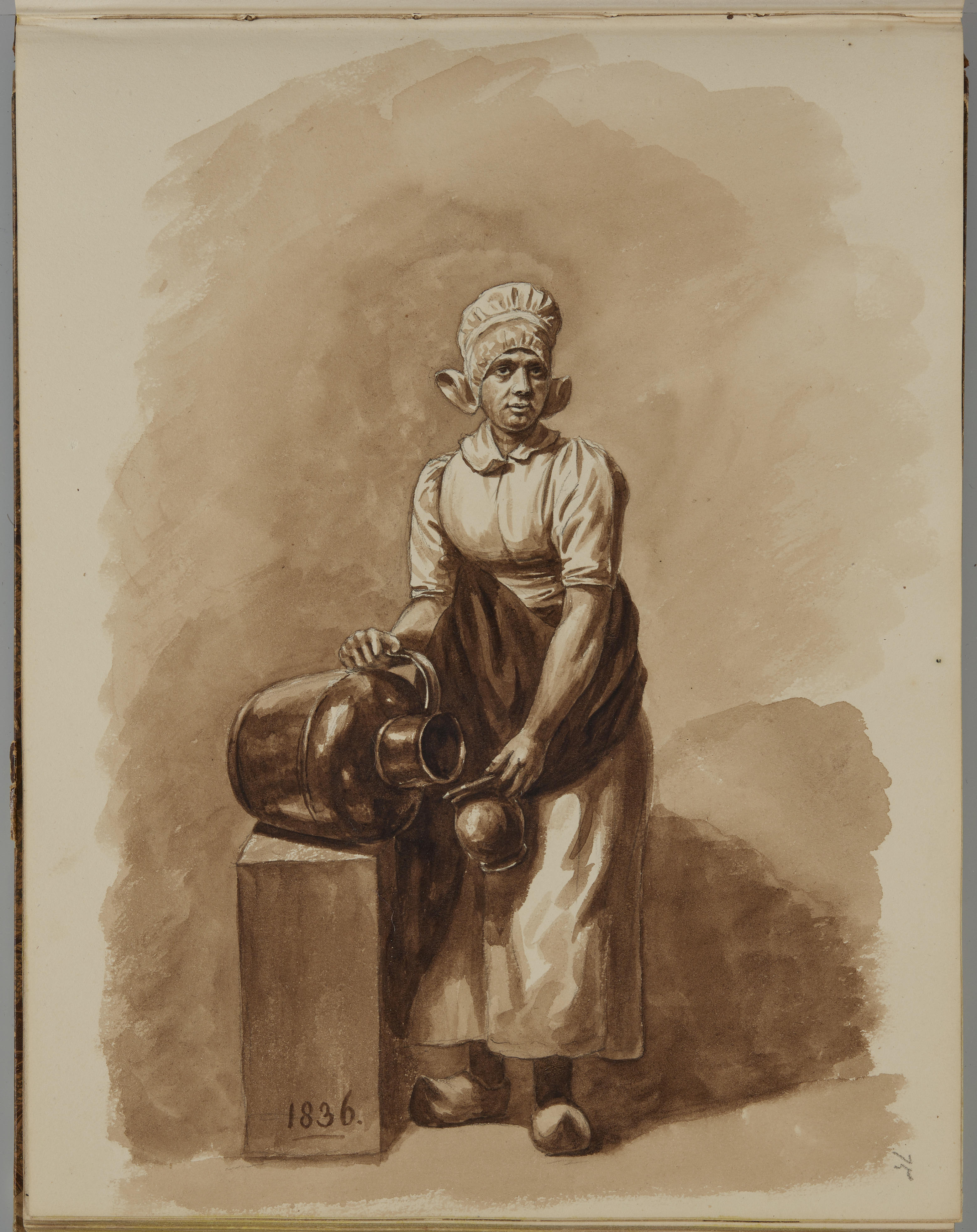 Tekening van een vrouw die melk overgiet, 1836