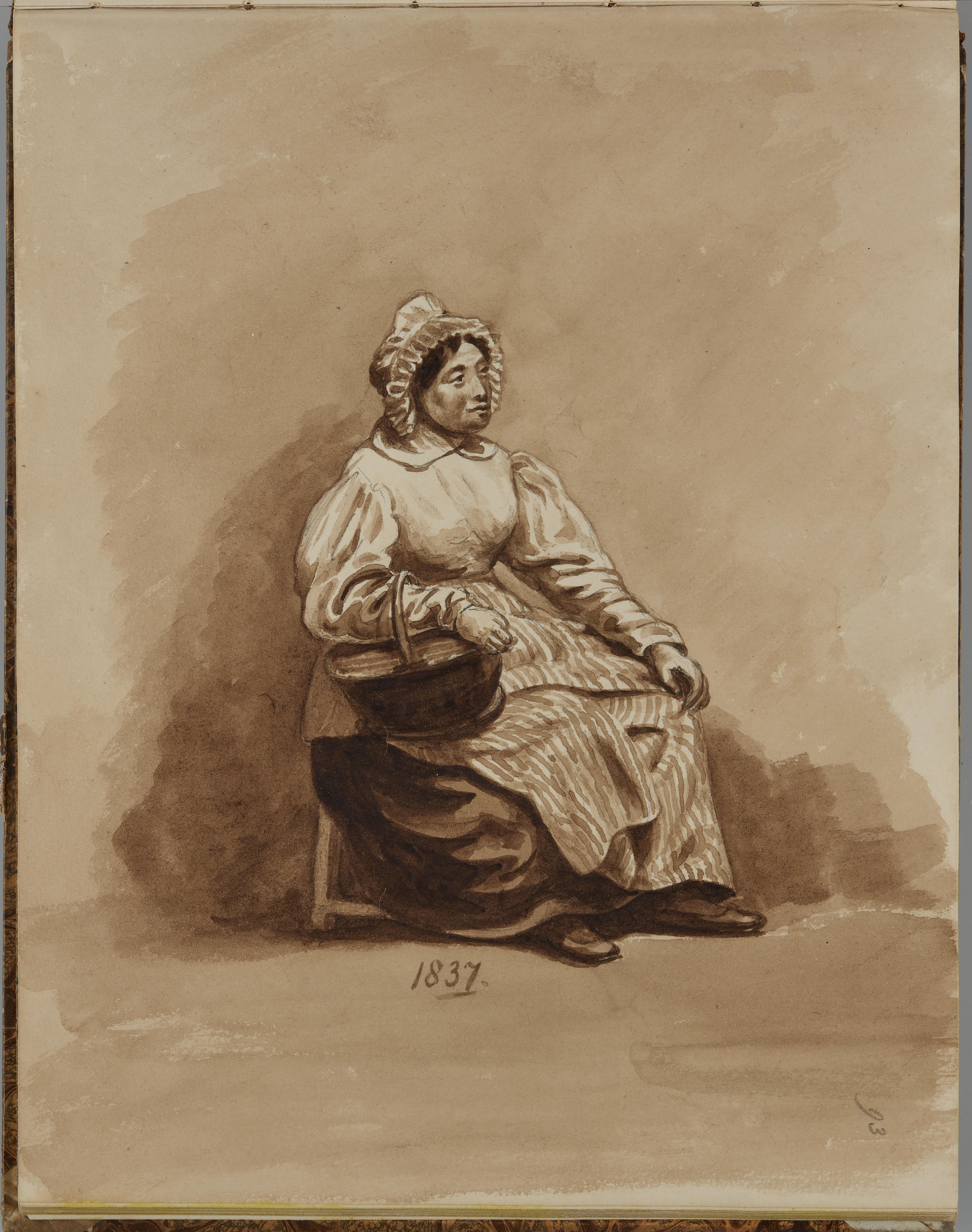 Tekening van een vrouw met een hengselmand, 1837