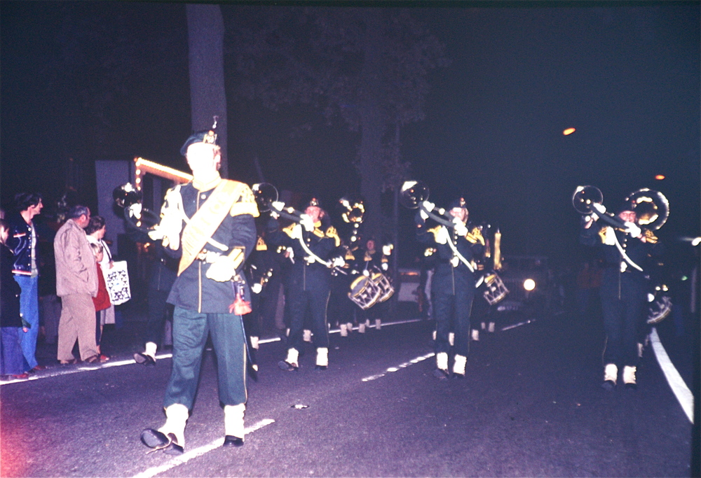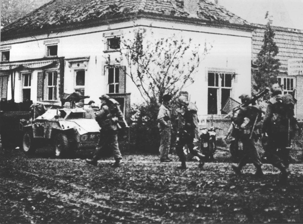 Canadese infanterie trekt langs cafe Hugen WOII,wo