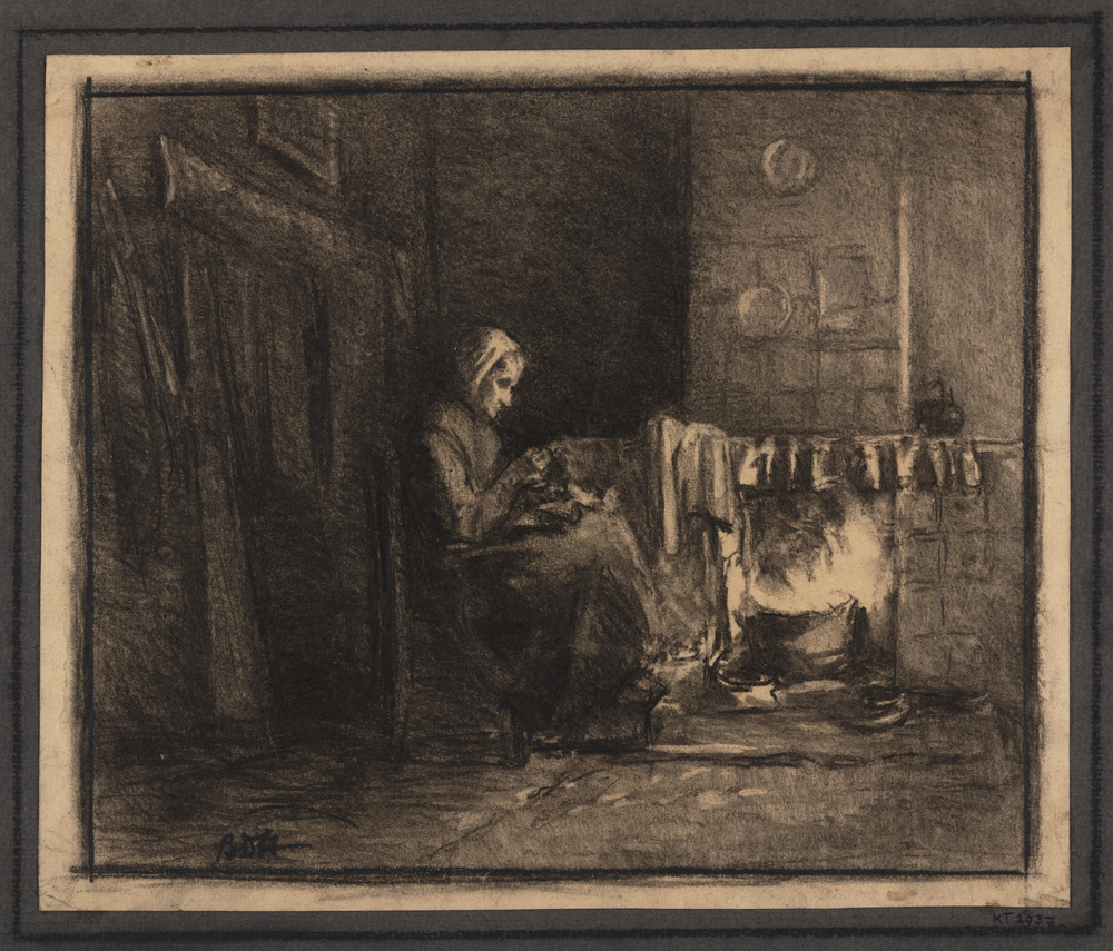 Boerin handwerkend bij het vuur
