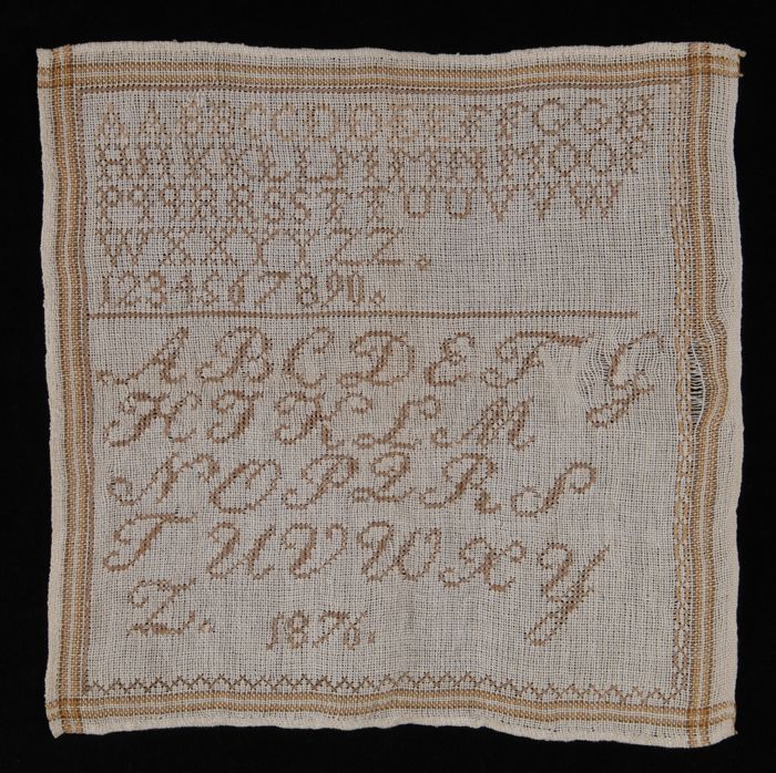 Vierkante letterlap gewerkt in kruissteek in bruin k...
