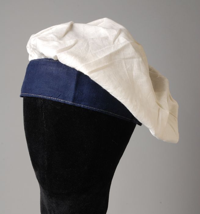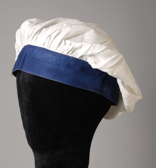 Muts, wit katoenen bol gerimpeld aan een blauwe band