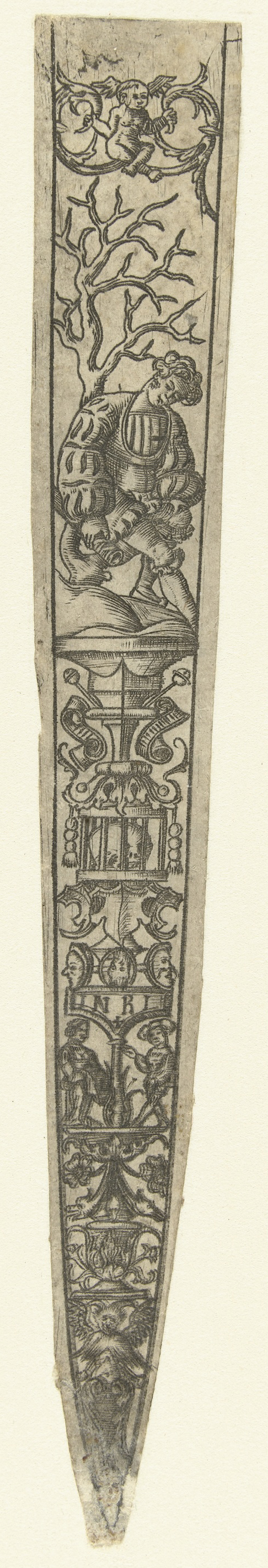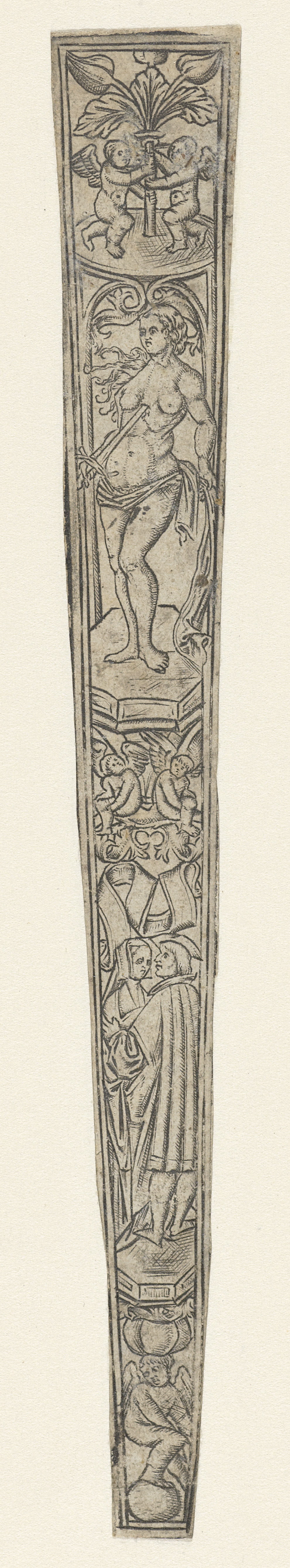 Schede met bovenaan een gevleugelde vrouw