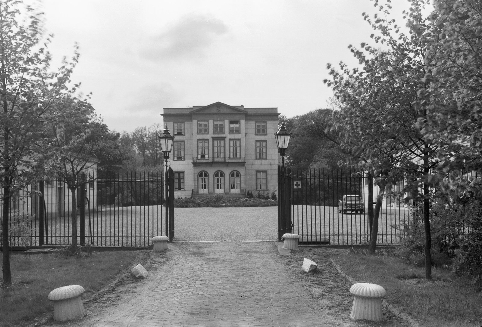 Zicht op de voorgevel van het landhuis met het toega...