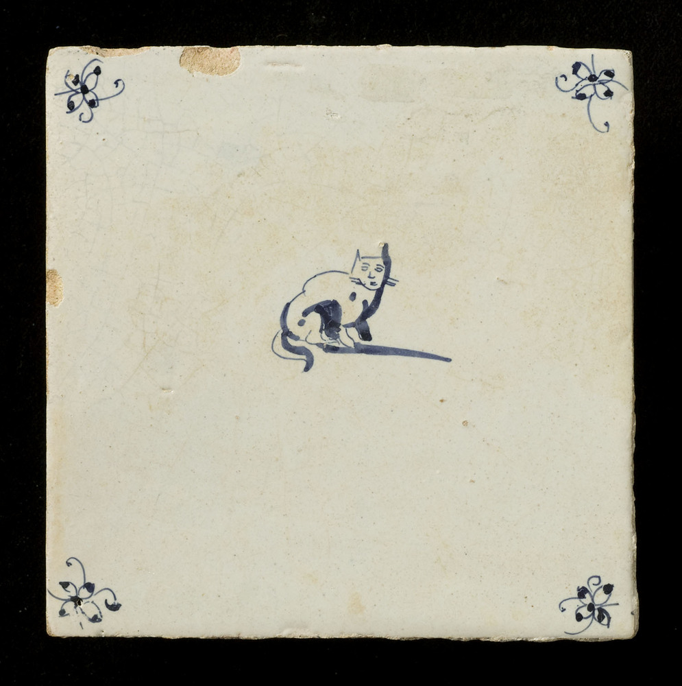 Tegel in tinglazuur, voorstellende kat, vervaardigd ...