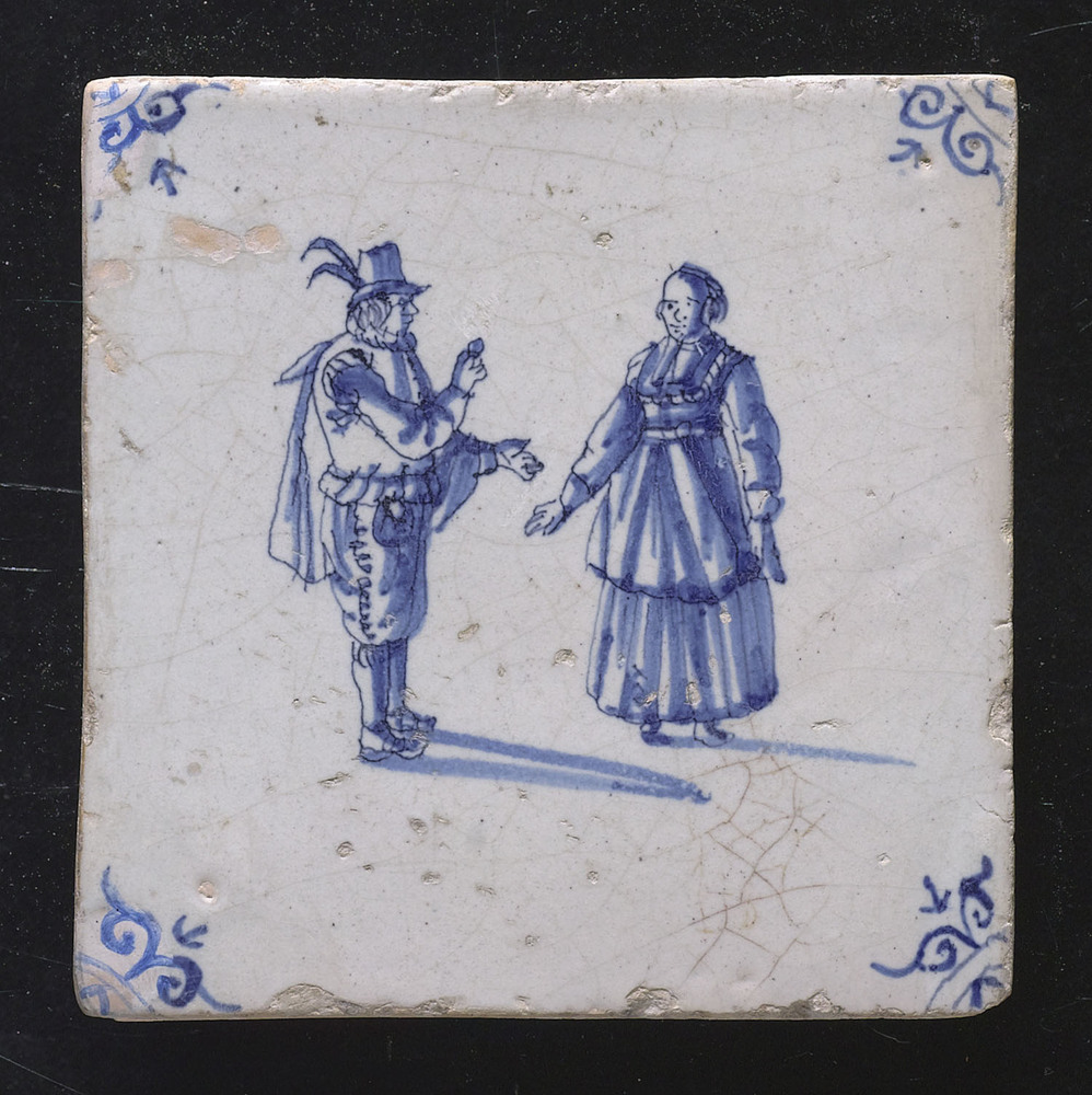 Tegel van aardewerk met tinglazuur, met een man die ...