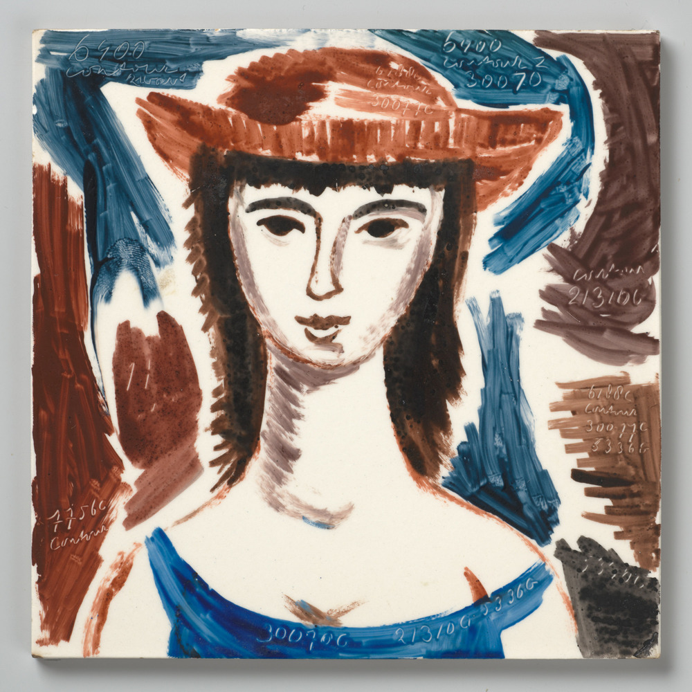 Tegel, geschilderd, met voorstelling: portret van vr...
