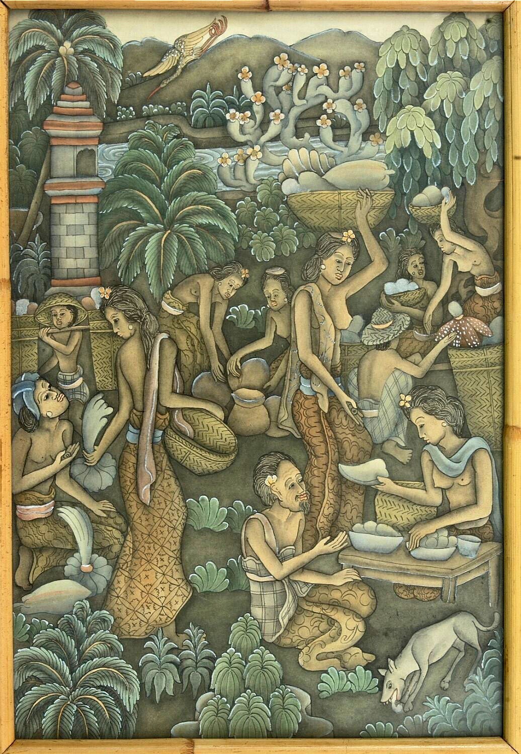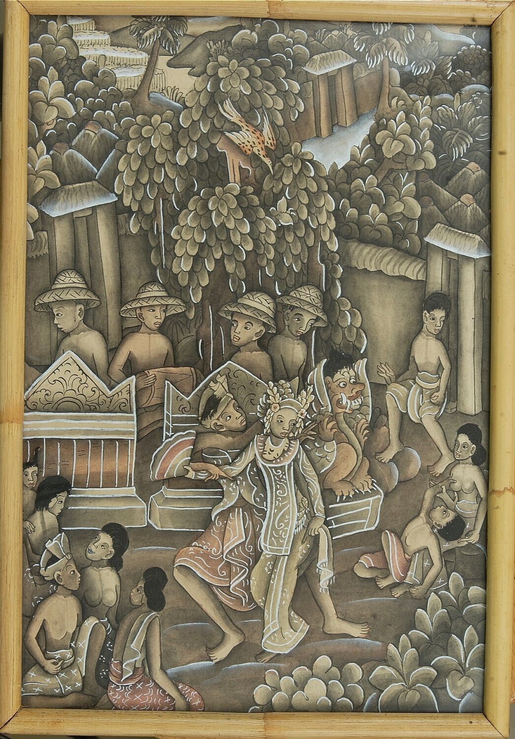 Gekleurde tekening van een Legong danseres in bamboe...