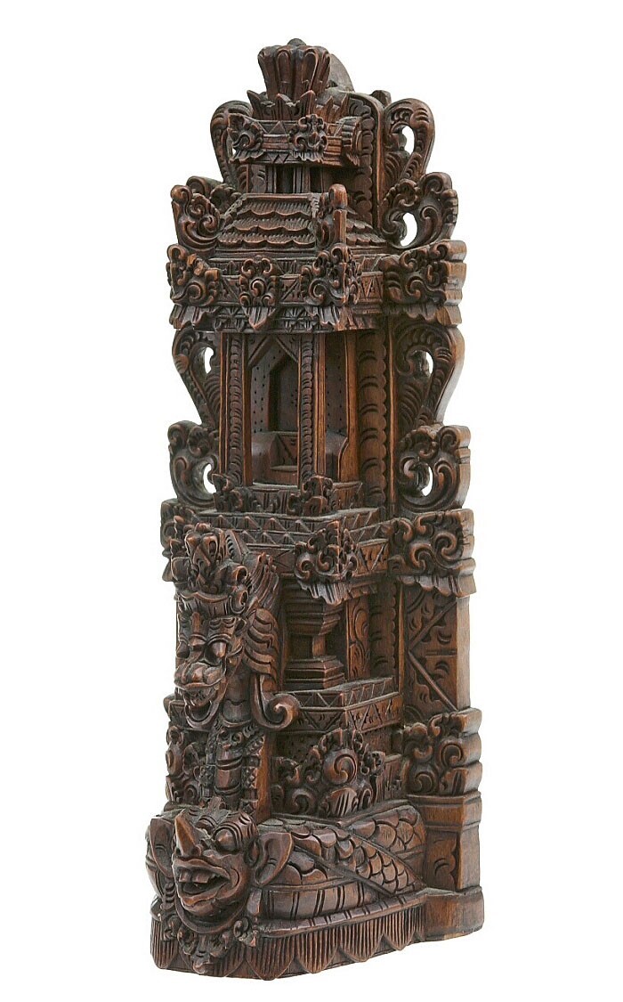 Houten beeld voorstellende een schrijn met de slang ...