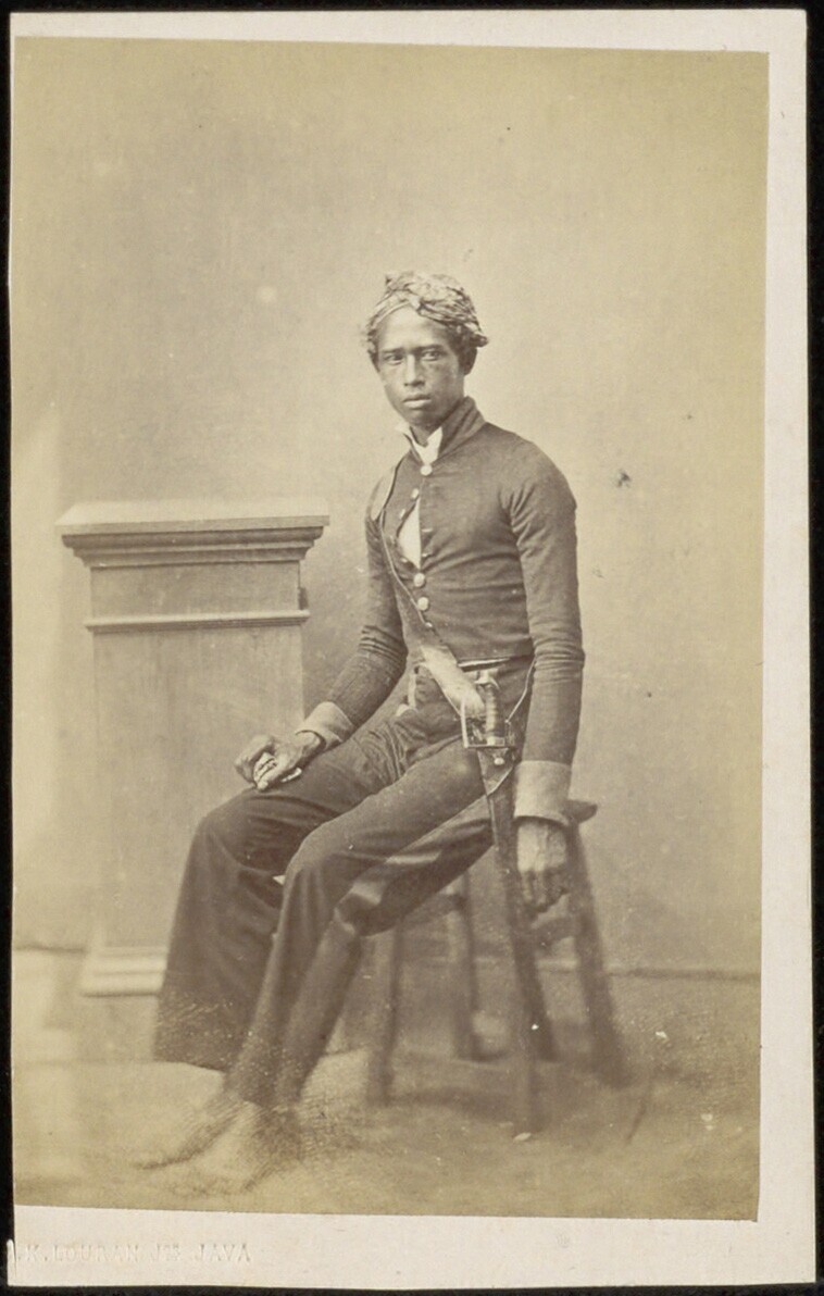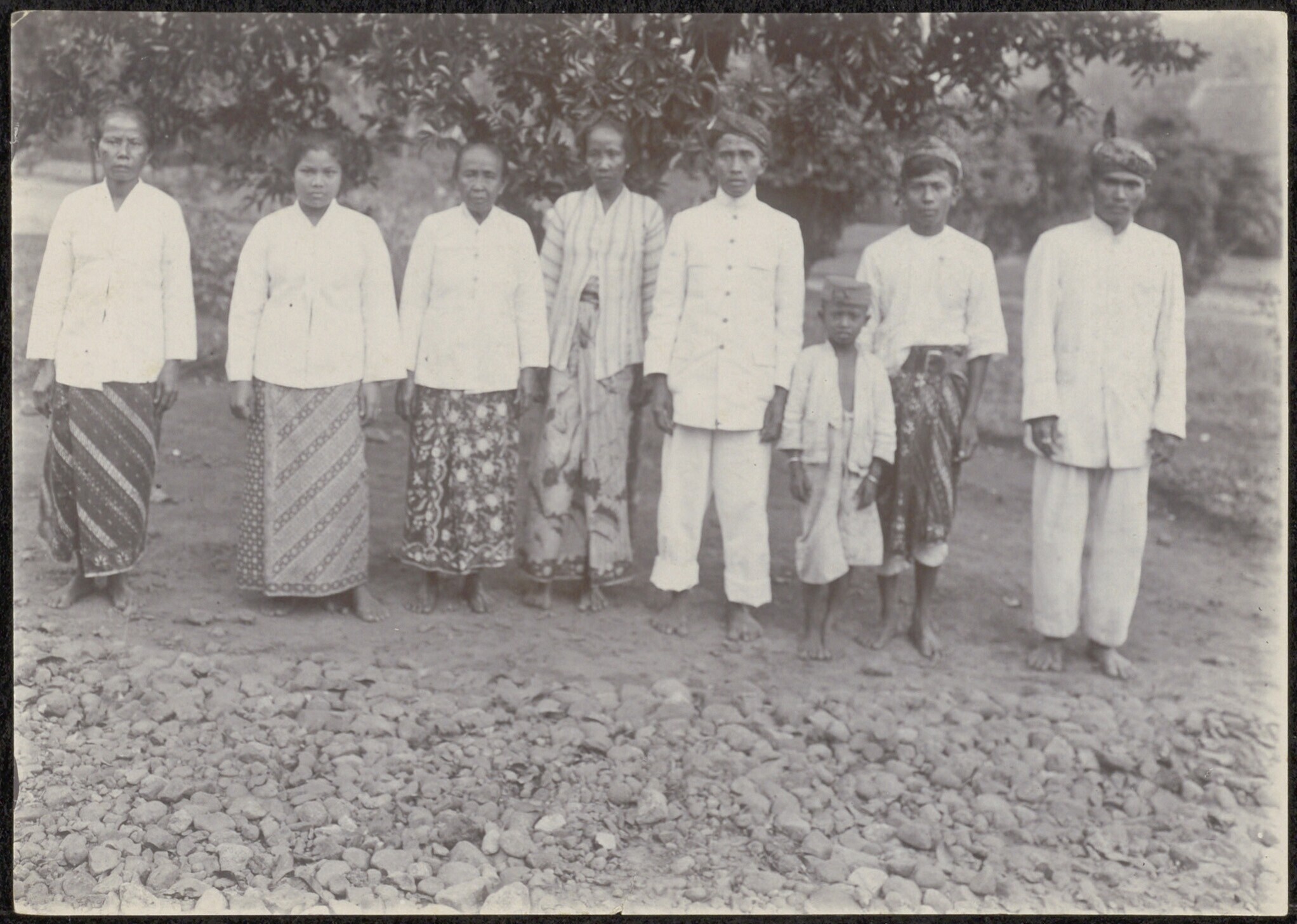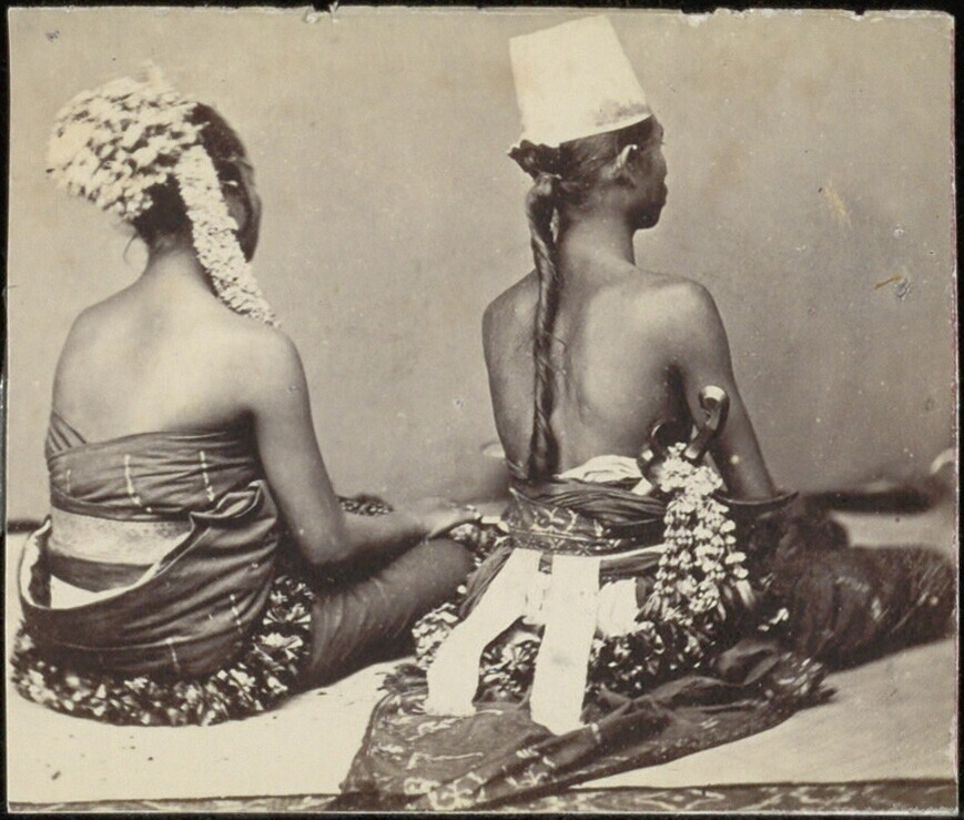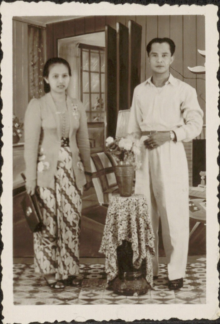 Studioportret van een Javaans bruidspaar, op de rug ...