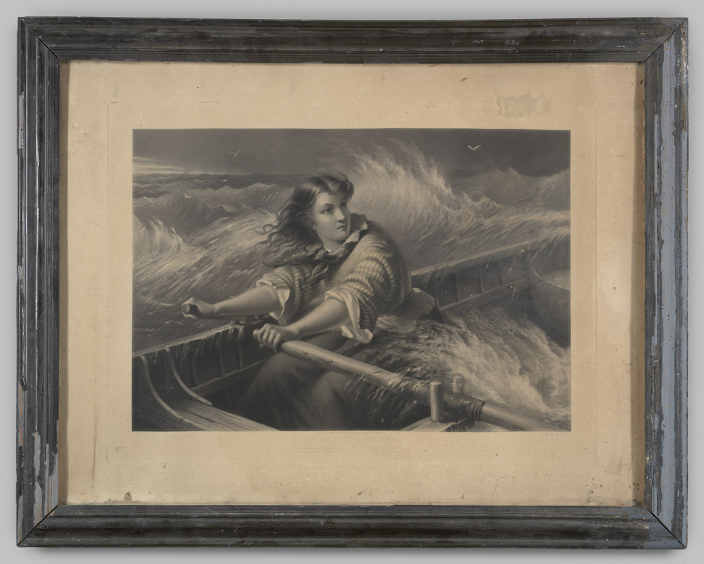 Lithografie van een vrouw in een roeiboot