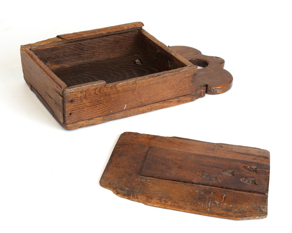 schaaf van eikenhout en ijzer, blokvormig met uitspa...